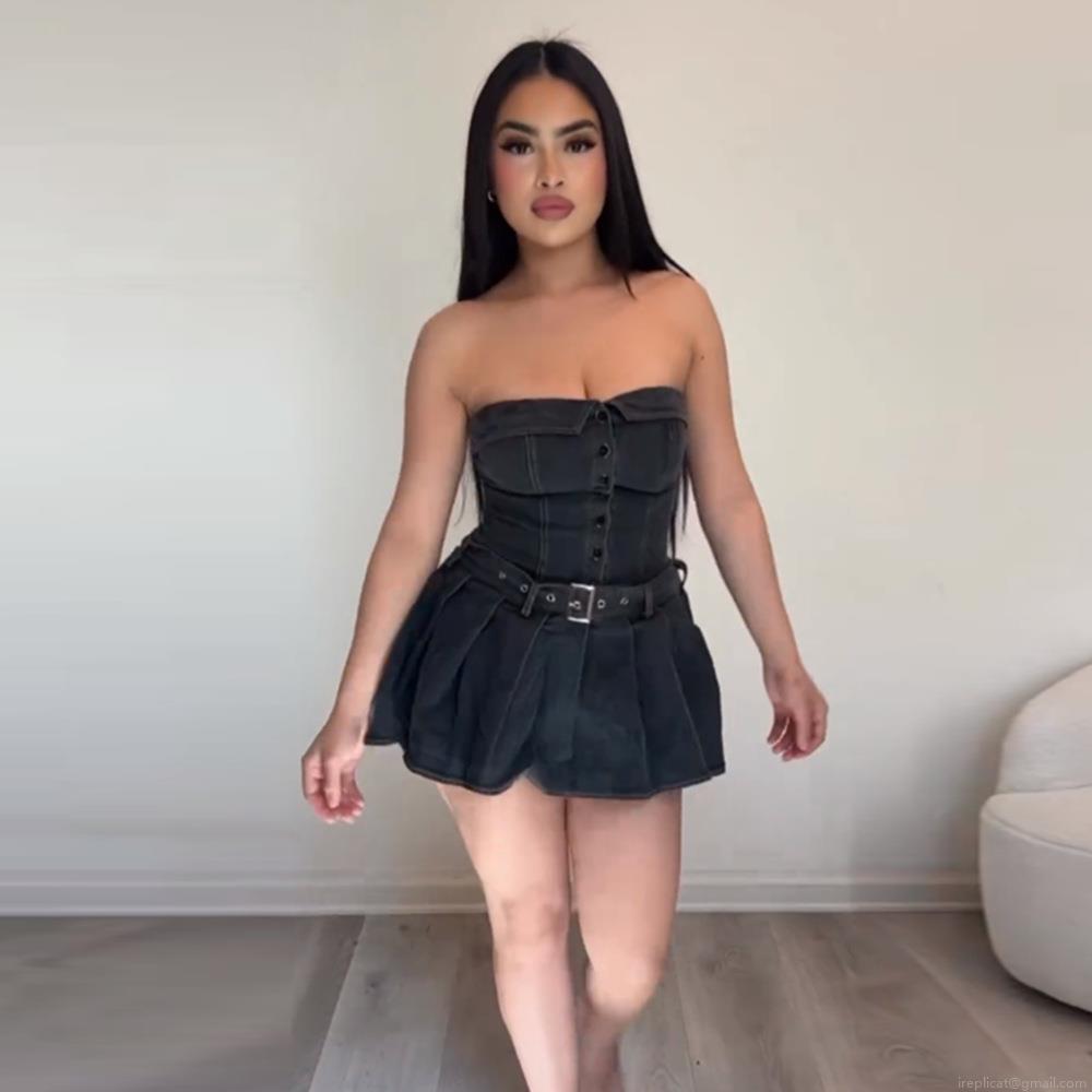 • Women Sexy Strapless Denim Mini Dress Stretchy Cotton Washed Jean Dress with Belt Button Up Pleated Hem Streetwear Y2K Slim Fit Sleeveless Party Dress