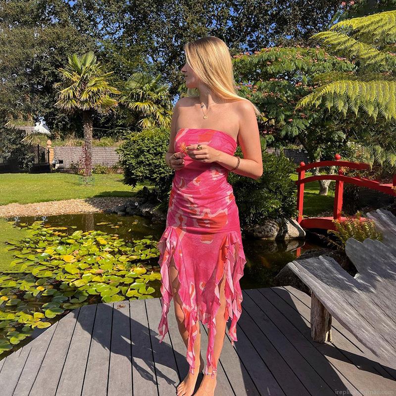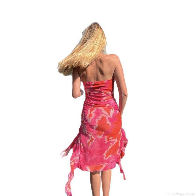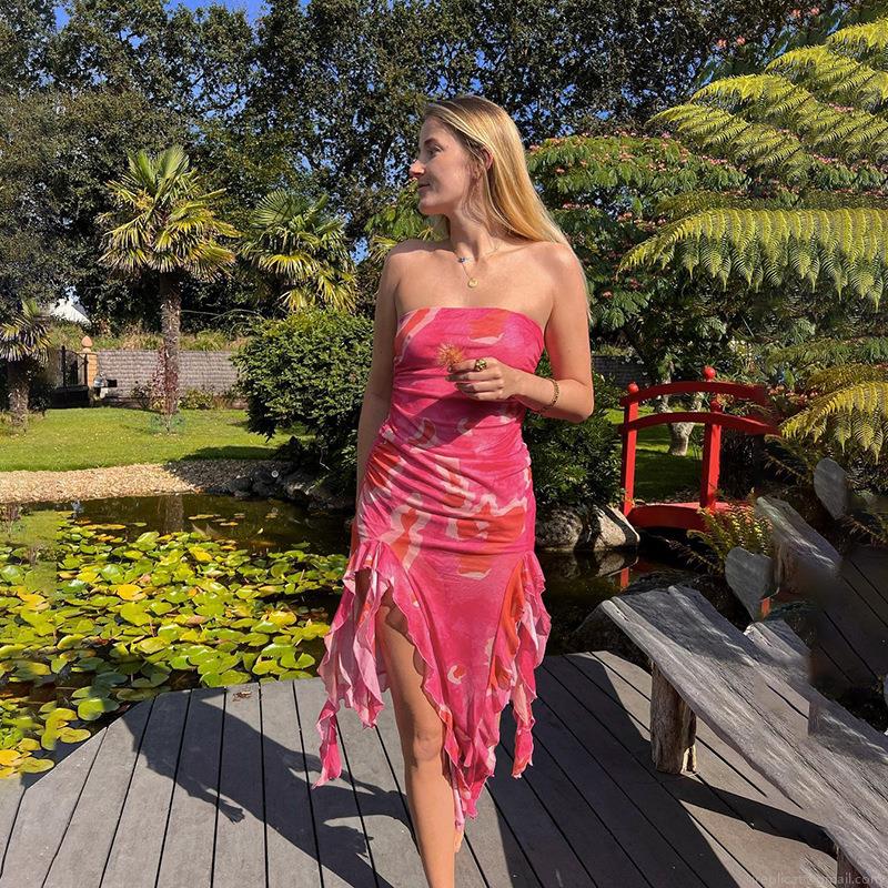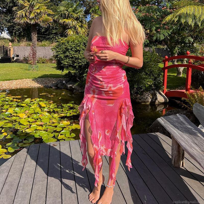 • Women Sexy Strapless Mesh Midi Dress Pink Abstract Print Ruffle Hem High Slit Bodycon Dress Summer Vacation Beach Party Evening Clubwear