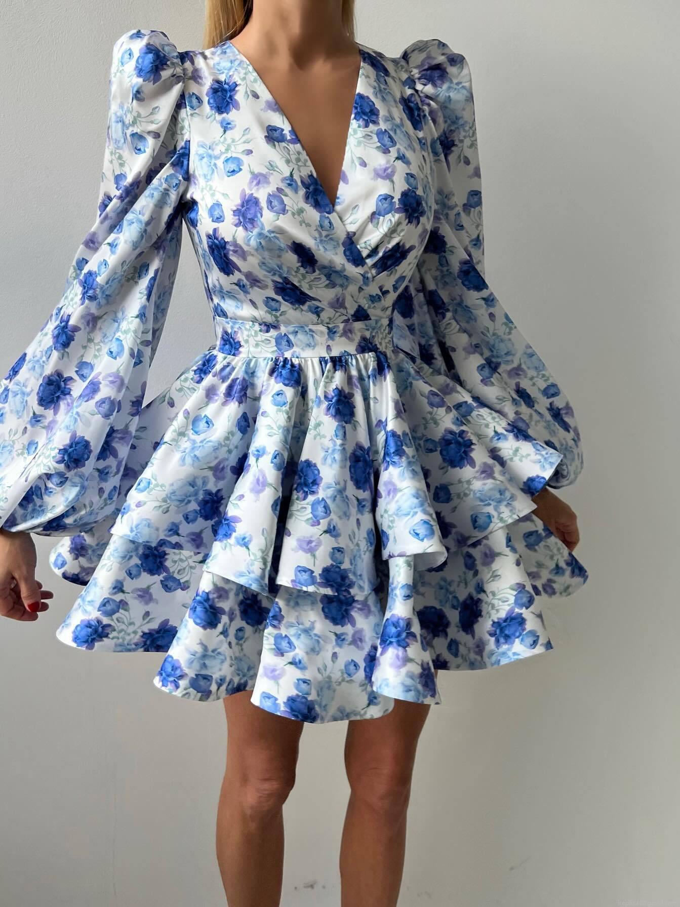 • Women Sexy V Neck Blue Floral Print Satin Polyester Blend Mini Dress With Long Puff Sleeve Backless Tiered Ruffle Princess Party Dress For Ladies Elegant Vacation Outfits