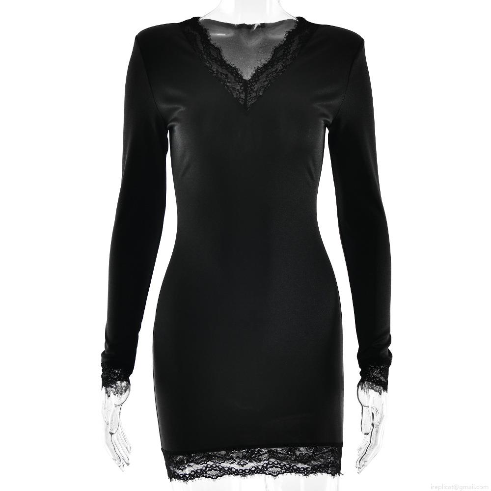 • Women Sexy V Neck Long Sleeve Bodycon Mini Dress With Lace Stitching Elegant Polyester Milk Silk Solid Black Short Dress For Club Party Date