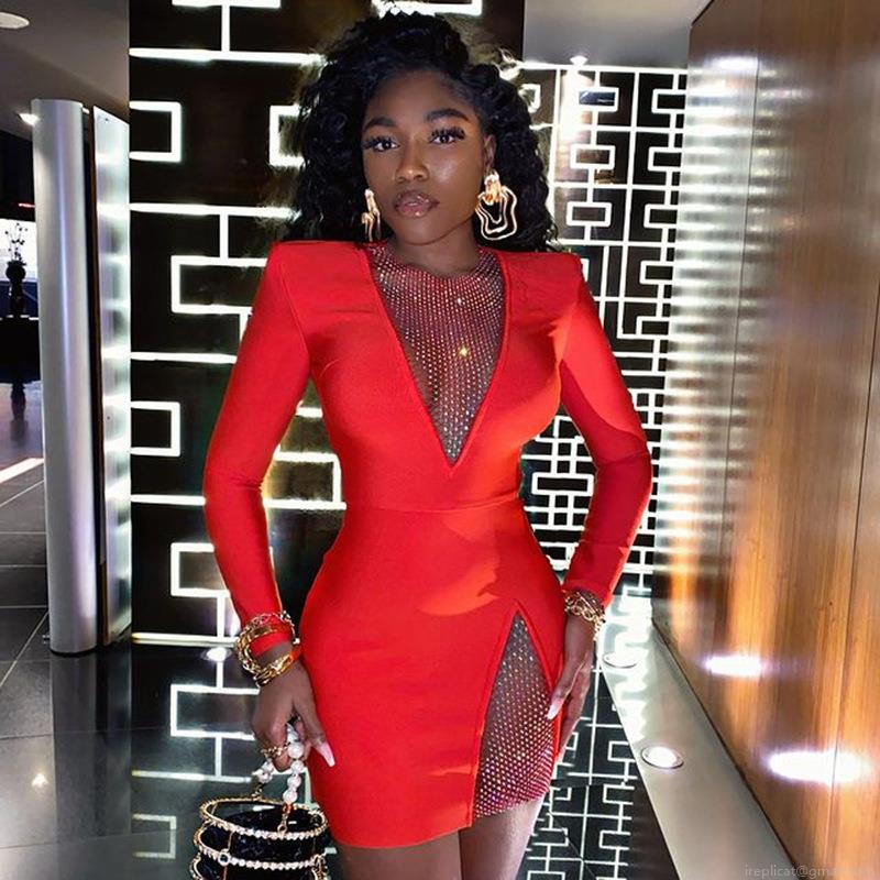 Women Sexy V Neck Long Sleeve Mini Dress Rhinestone Mesh Patchwork Bodycon Slit Party Club Evening Dress