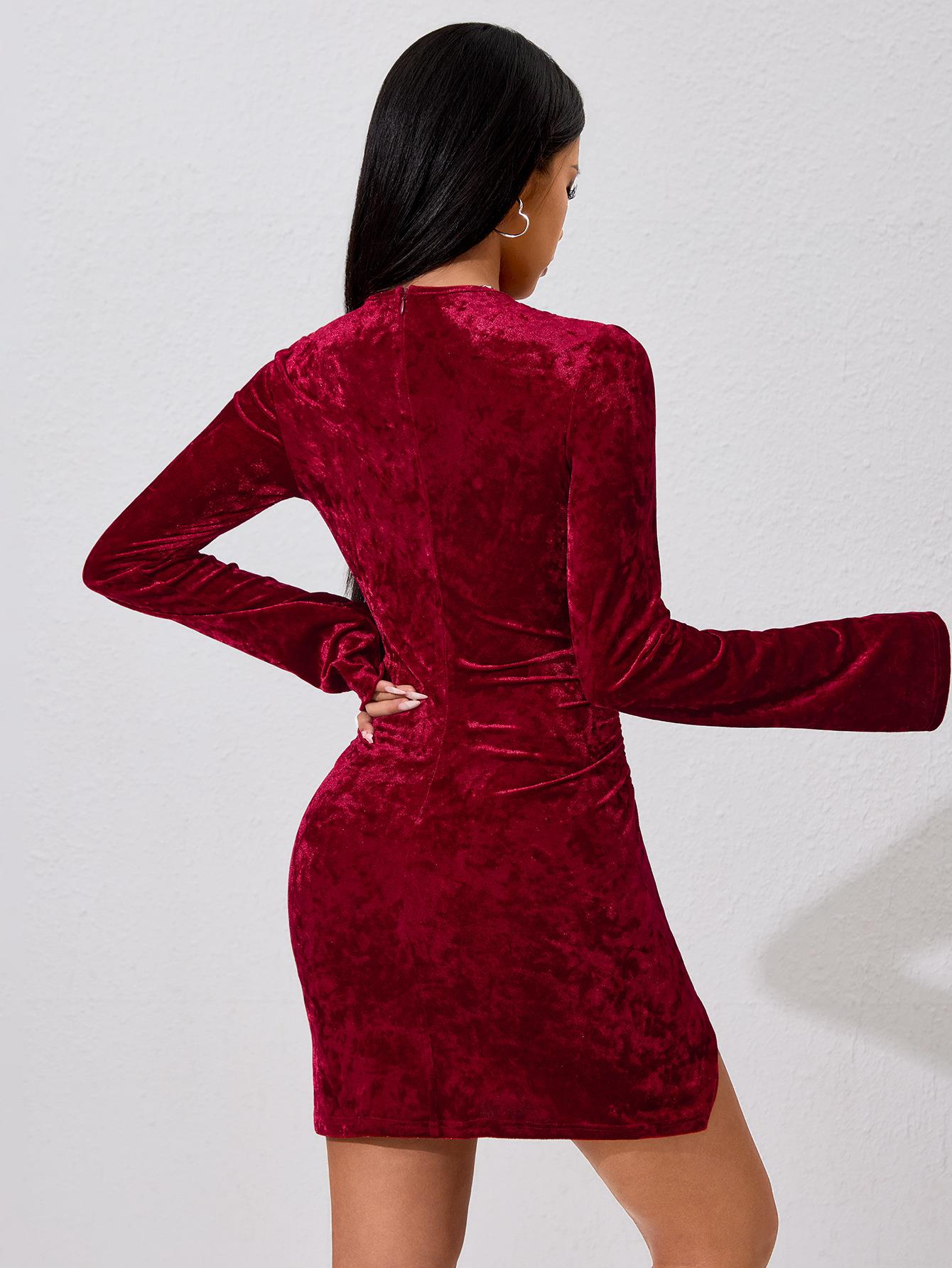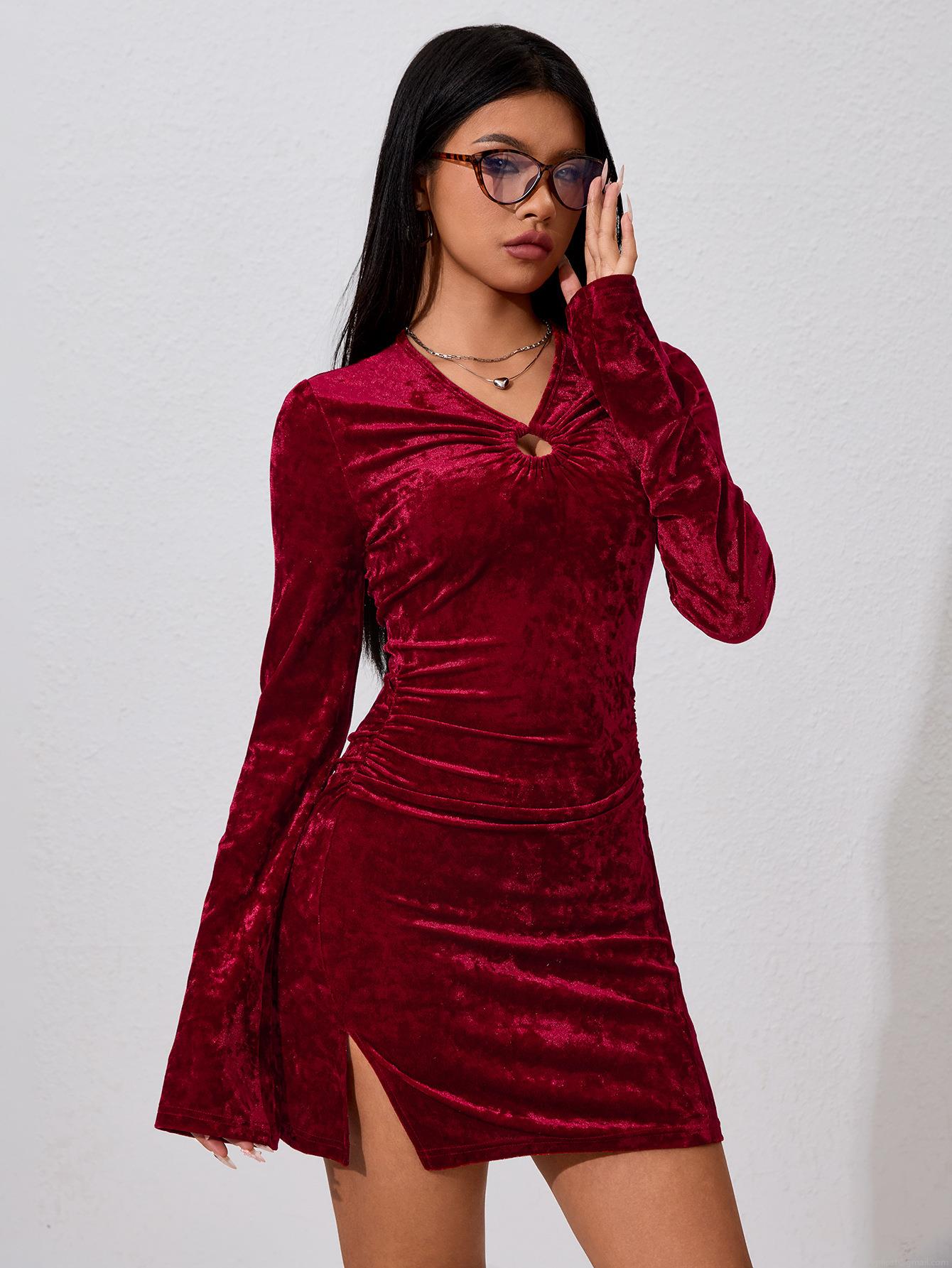 • Women Sexy Velvet Mini Dress V Neck Hollow Out Ruched Bodycon Dress Long Flare Sleeve Elegant Evening Party Club Short Dress