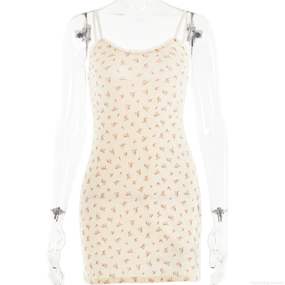 • Women Sexy V-Neck Floral Mini Dress Lace Trim Backless Spaghetti Strap Ribbed Knit Bodycon Dress Summer Vacation Beach Sundress