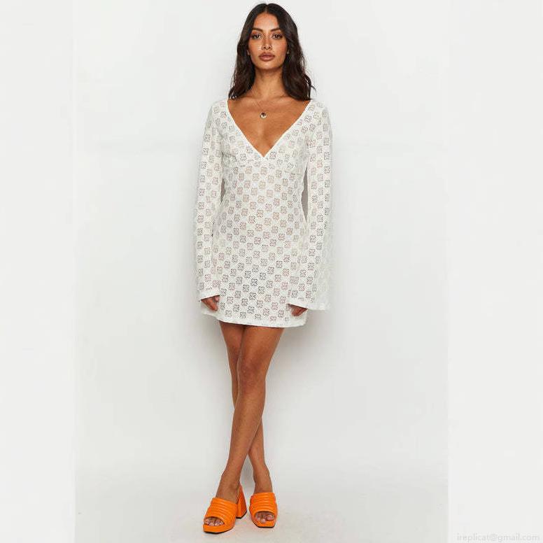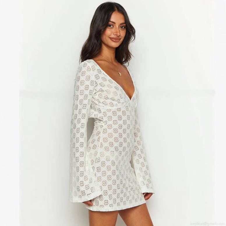 • Women Sexy V-Neck Lace Mini Dress Long Sleeve Backless Lace-Up Bodycon Clubwear Party Streetwear Summer White Polyester Hollow Out Dress