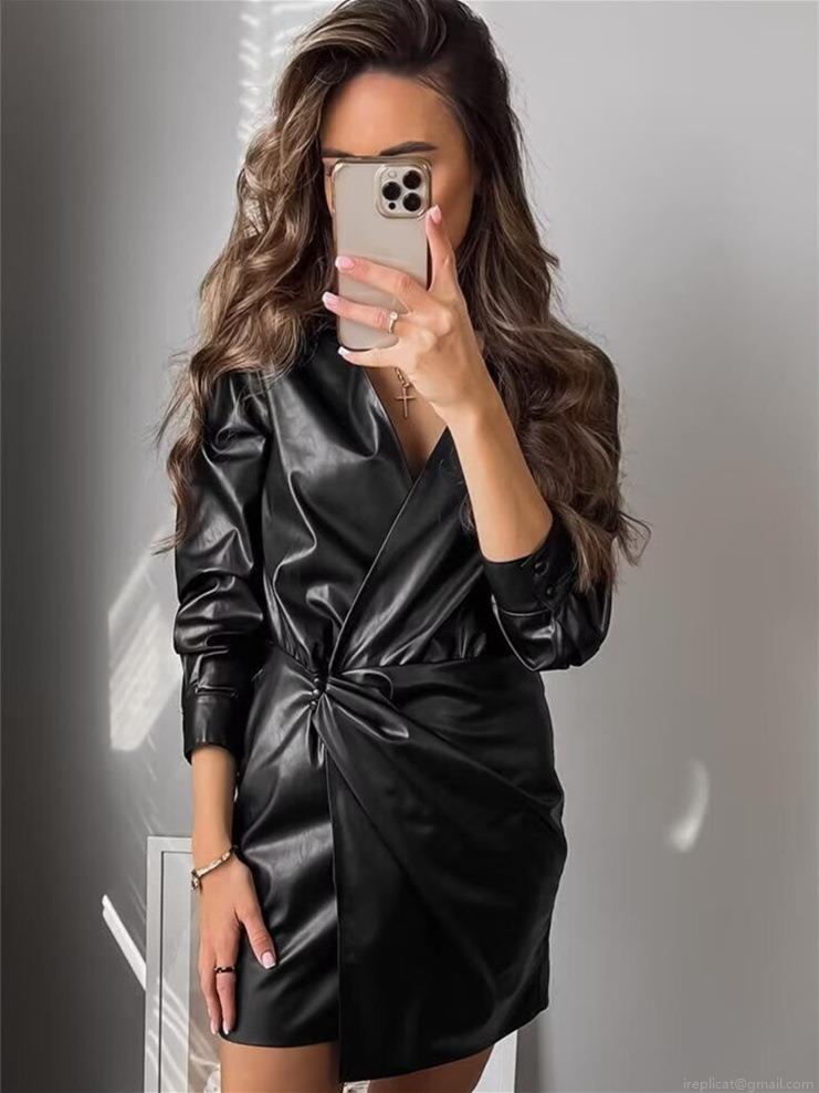 Women Sexy V-Neck PU Leather Mini Dress Long Sleeve Wrap Bodycon Party Clubwear Spring Autumn Short Dress Faux Leather Sheath Dress