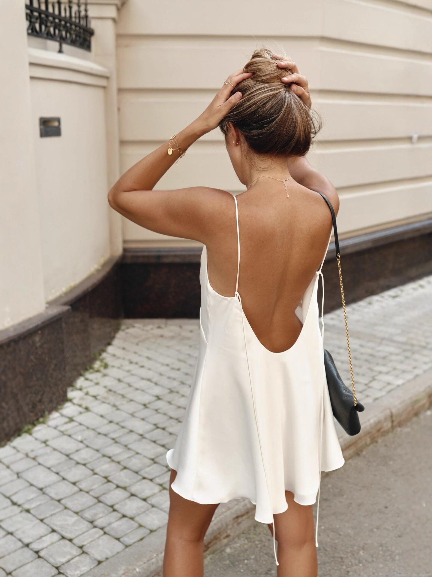 • Women Sexy V-Neck Satin Mini Dress Summer Vacation Backless Spaghetti Strap Lace Splicing A-Line Party Dress For Ladies