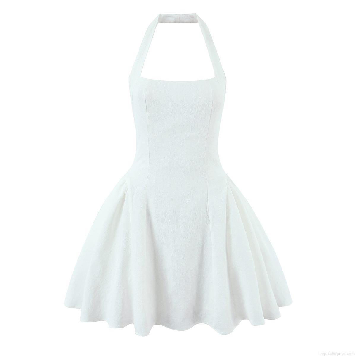 Women Sexy White Halter Neck Backless Mini Dress Elegant Textured Jacquard High Waist Flare A-Line Party Dress Summer Beach Clubwear