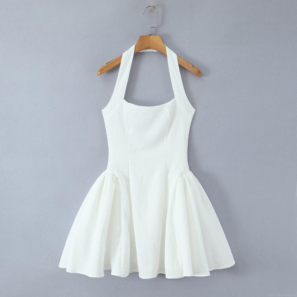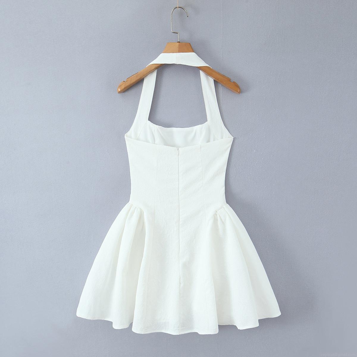 • Women Sexy White Halter Neck Backless Mini Dress Elegant Textured Jacquard High Waist Flare A-Line Party Dress Summer Beach Clubwear