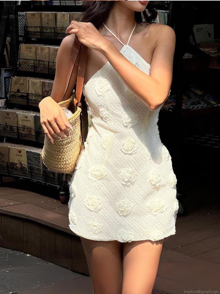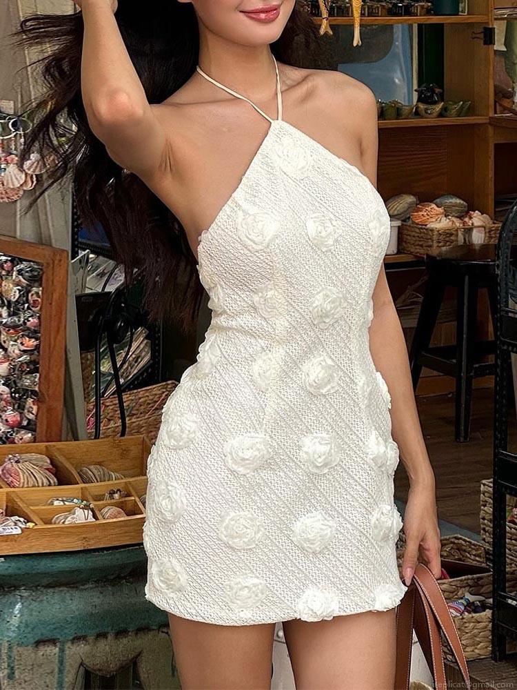 • Women Sexy White Halter Neck Mini Dress With 3D Rose Flower Backless Knit Sleeveless Bodycon Party Dress For Summer Vacation Clubwear