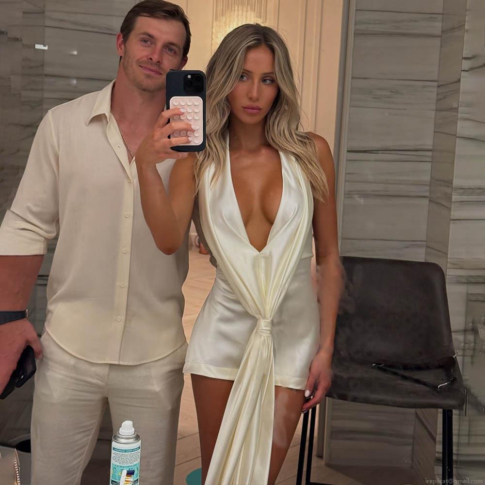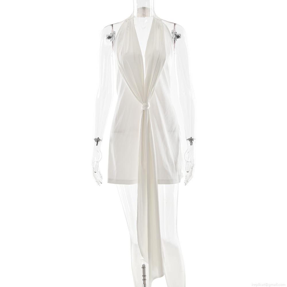 Women Sexy White Satin Halter Mini Dress Deep V Neck Backless Knot Ruched Bodycon Party Dress Sleeveless Glossy Summer Clubwear Evening Gown