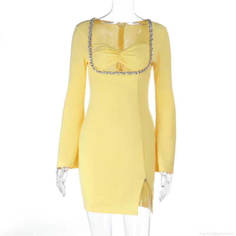 • Women Sexy Yellow Square Neck Long Sleeve Bodycon Mini Dress With Rhinestone Trim Cutout Detail Slit Party Dress Polyester Spandex Fashion Short Skirt
