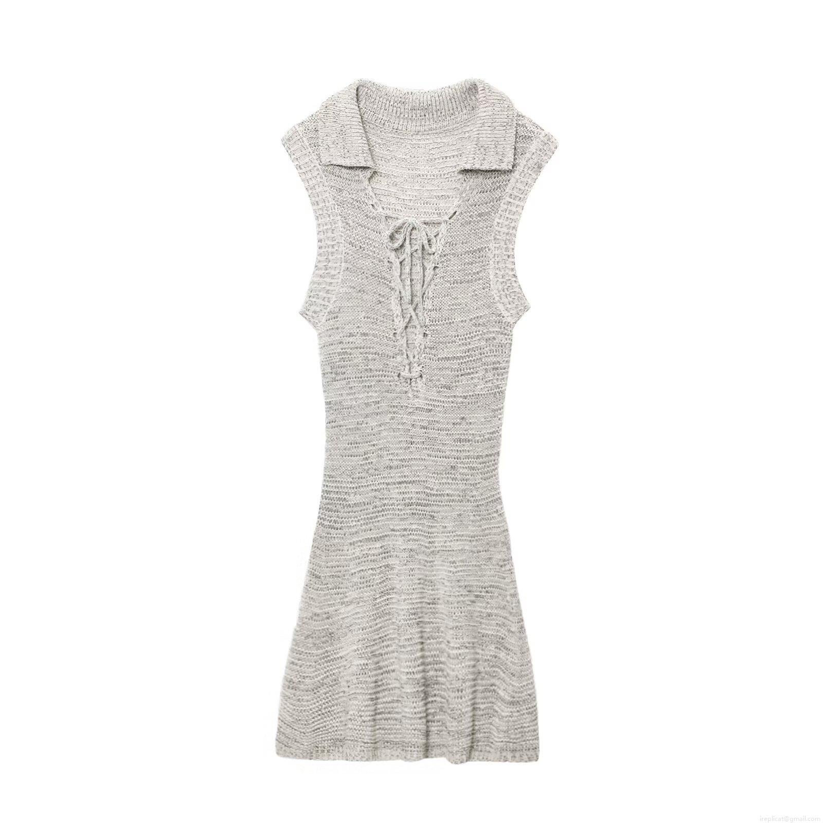• Women Sleeveless Knit Mini Dress Sexy Lapel Lace Up Slim Fit Oatmeal Bodycon Dress Summer Casual Party Beach Streetwear Ladies Short Dresses