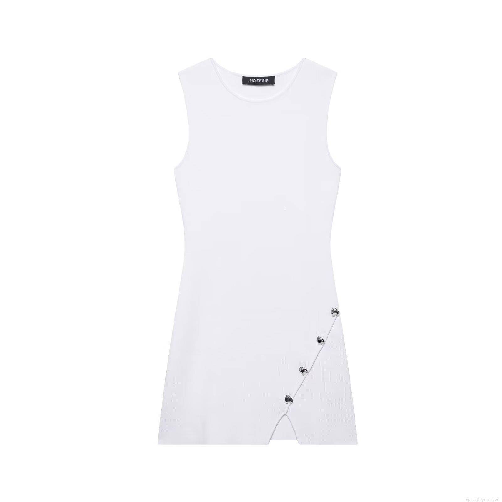 Women Sleeveless Knitted Mini Dress Round Neck Slim Fit Irregular Slit Hem With Heart Metal Buttons Solid Color Summer Casual Streetwear Fashion