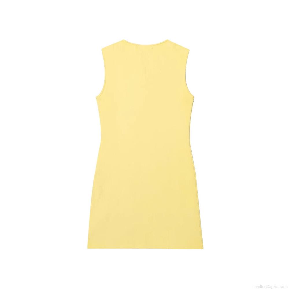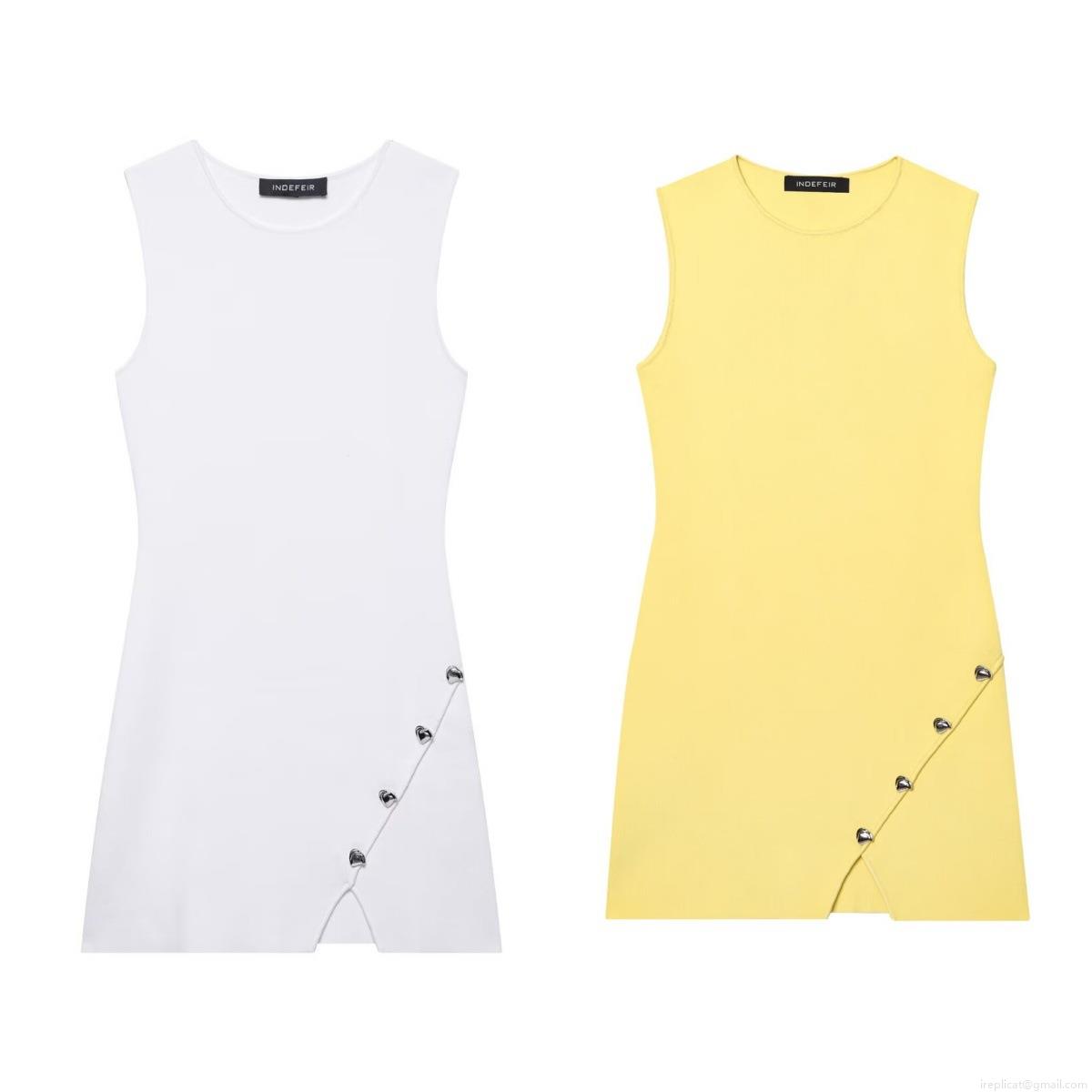 • Women Sleeveless Knitted Mini Dress Round Neck Slim Fit Irregular Slit Hem With Heart Metal Buttons Solid Color Summer Casual Streetwear Fashion