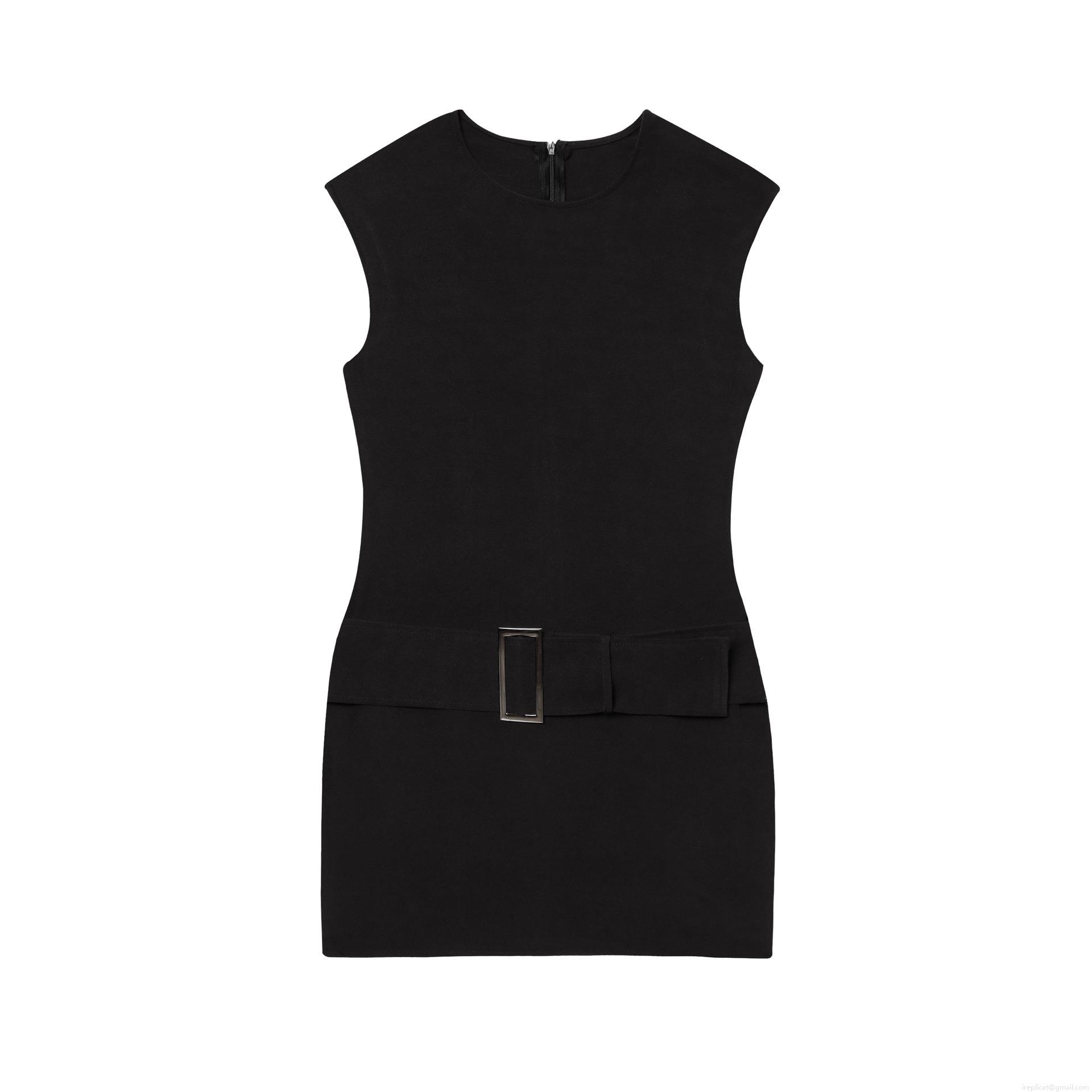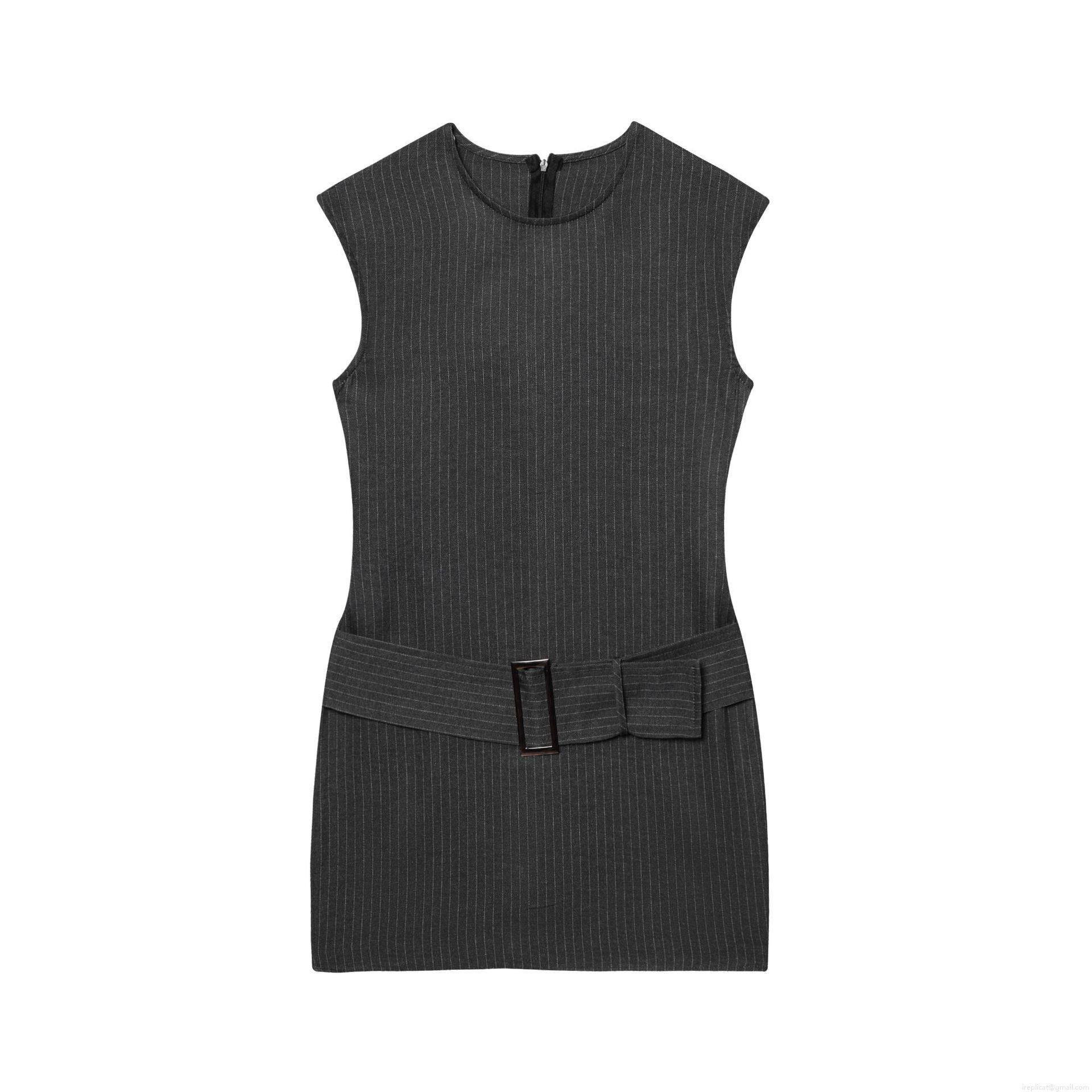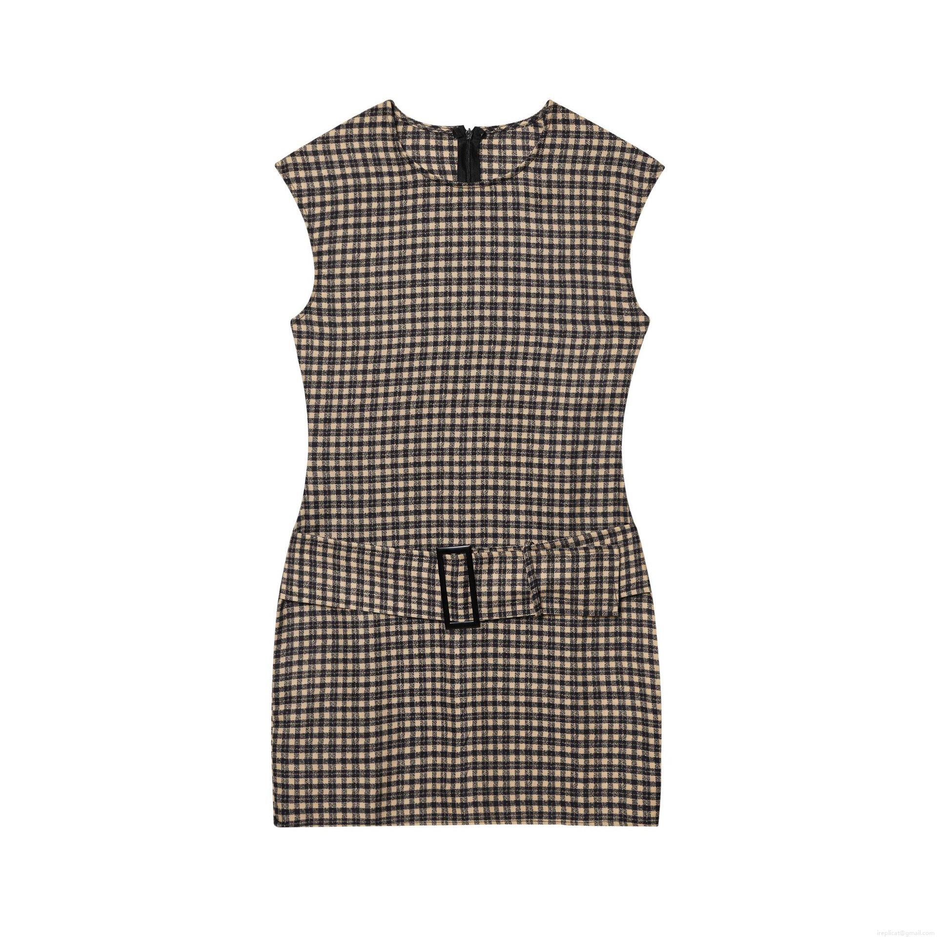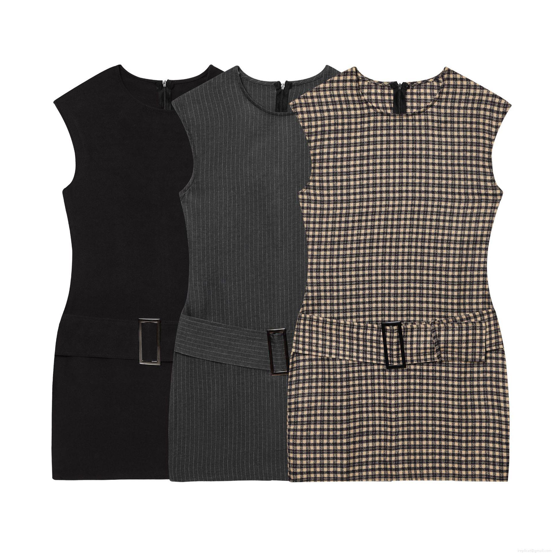 • Women Sleeveless Round Neck Bodycon Dress With Belt Metal Buckle Plaid Striped Solid Polyester Woven Casual Party Streetwear Slim Fit Dress