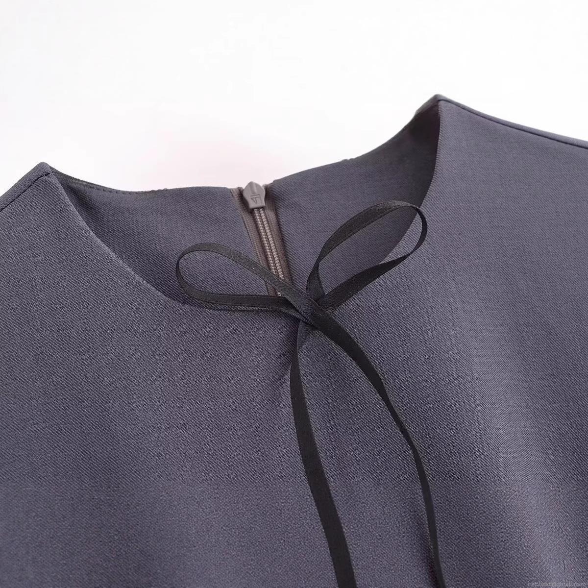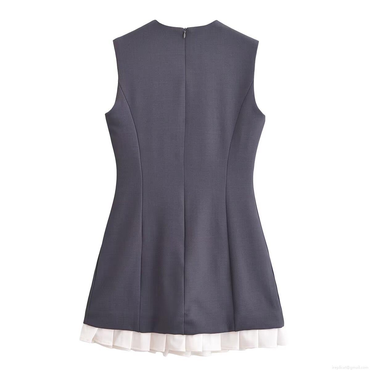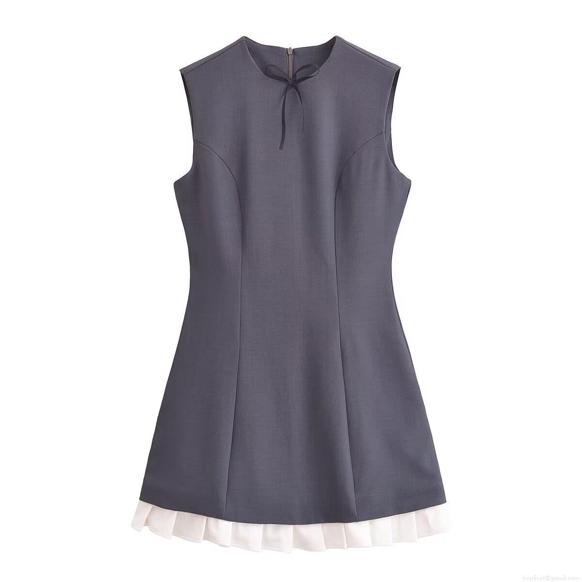 • Women Sleeveless Round Neck Mini Dress Bow Tie Spliced Contrast Pleated Hem Polyester Short Casual Dress Streetwear Style Summer Clothing