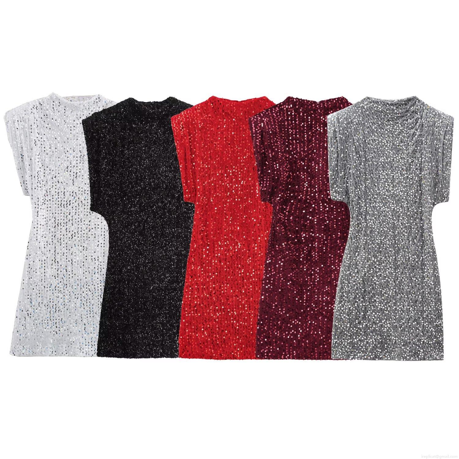• Women Sleeveless Sequin Mini Dress Sparkling Padded Shoulder Bodycon Party Nightclub Round Neck Back Zipper Polyester Evening Wear For Ladies