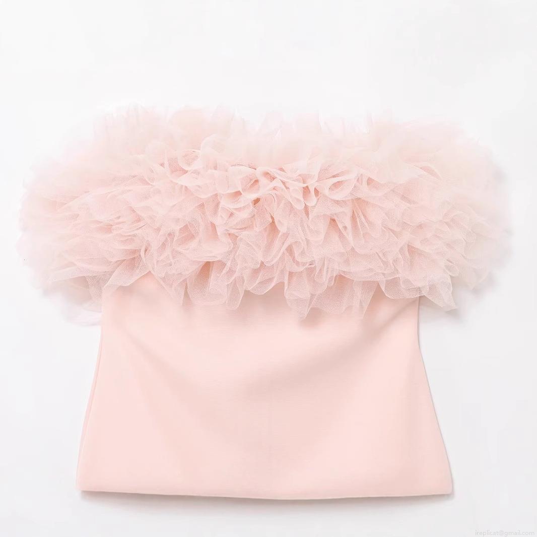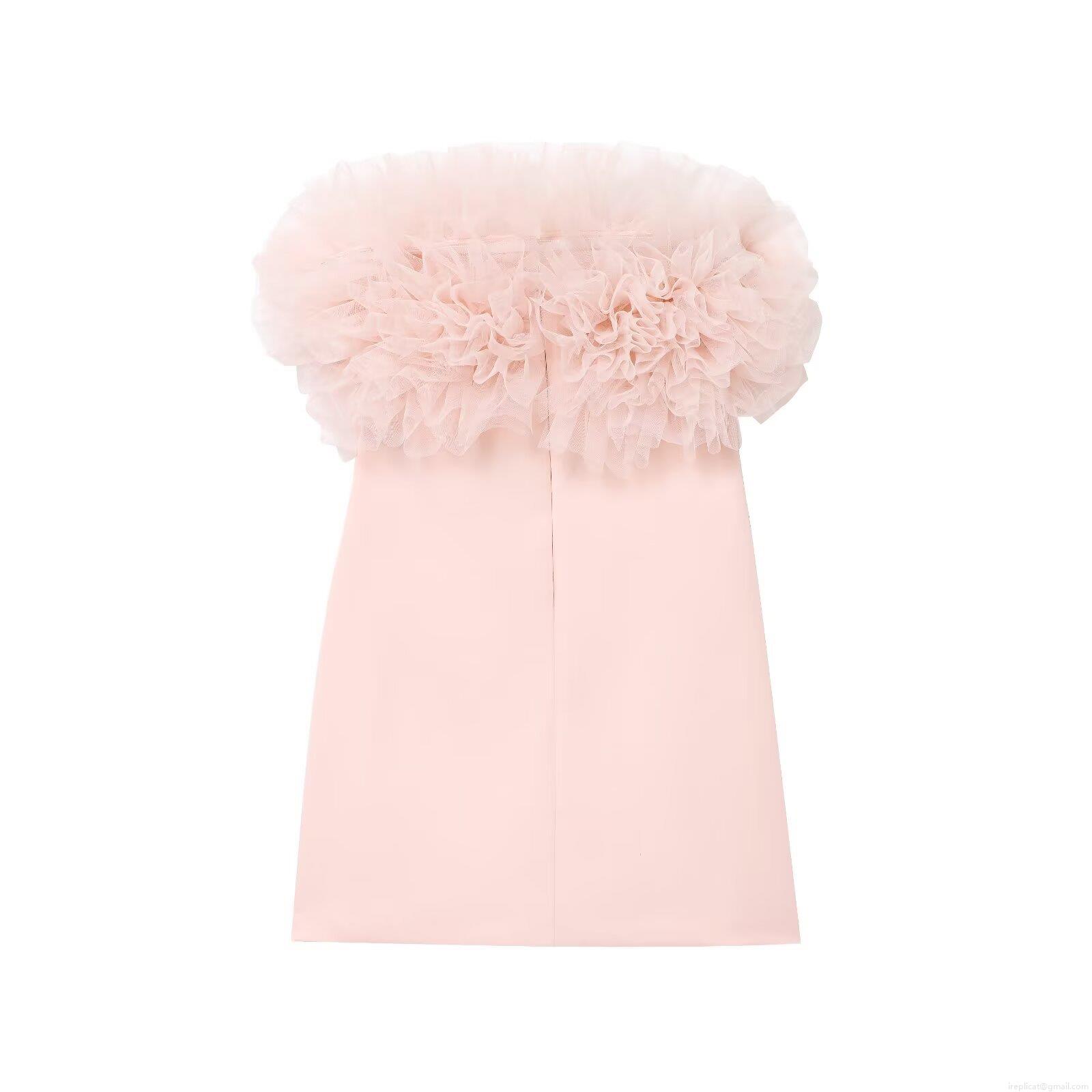 • Women Strapless Mesh Tulle Mini Dress Sweet Ruffle Layered Pink Tube Top Party Dress Elegant Sleeveless Short Ball Gown Prom Dress for Women