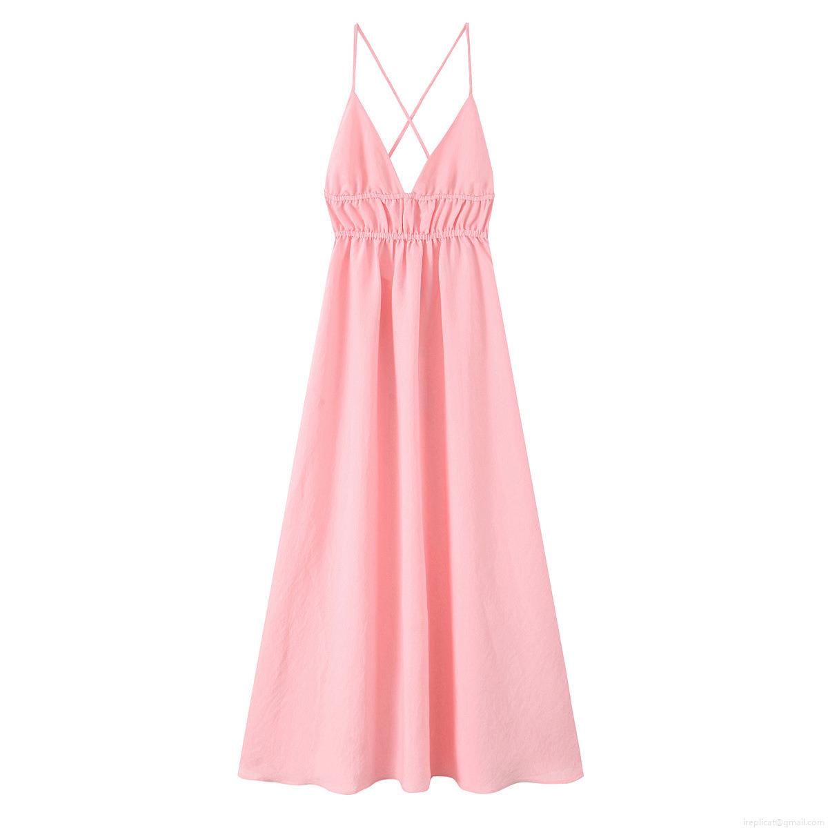 • Women Summer Backless Cross Spaghetti Strap Midi Dress Sexy V Neck High Waist Shirred Solid Color Polyester Long Swing Dress For Beach Vacation Streetwear