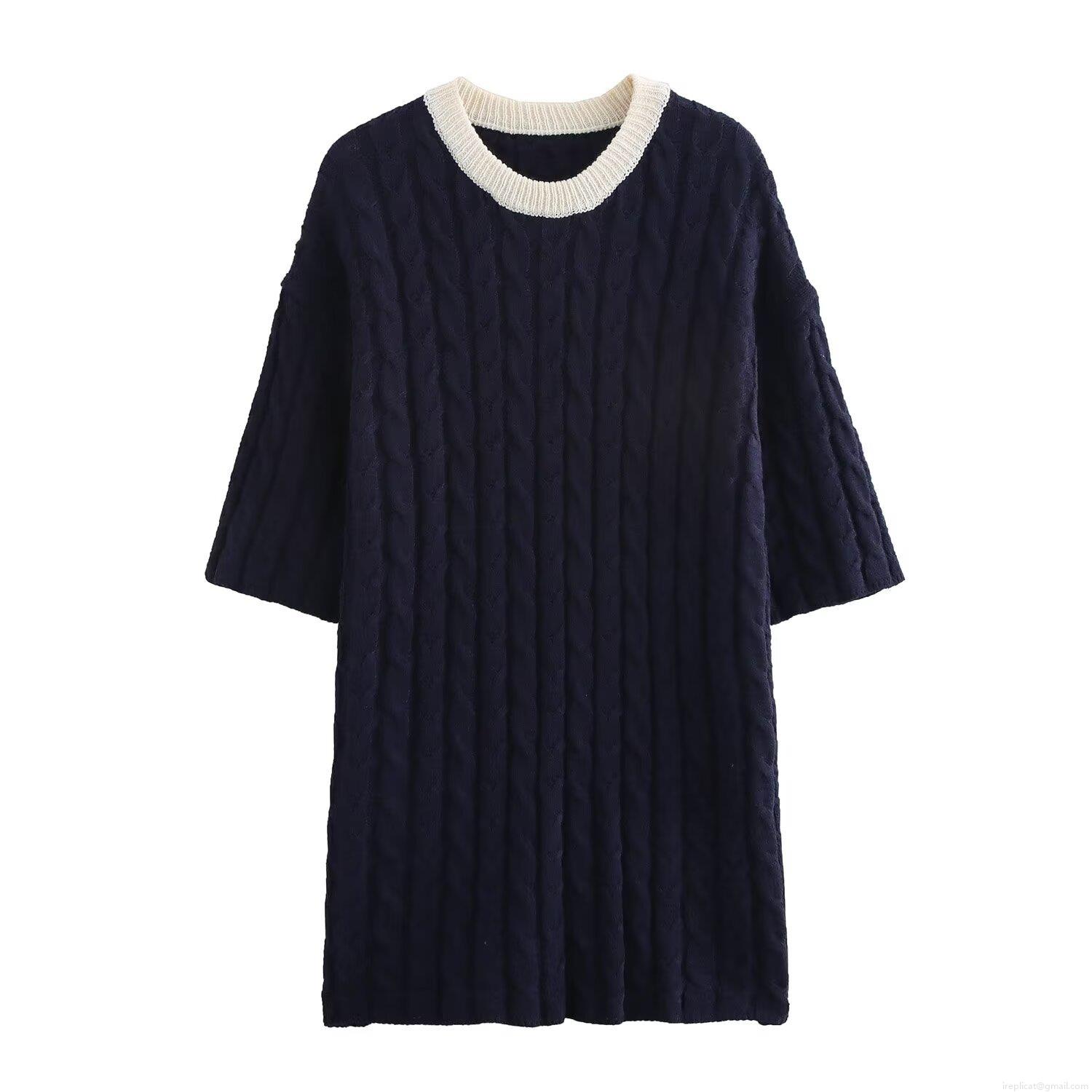 • Women Summer Cable Knit Mini Dress Contrast Round Neck Short Sleeve Polyester A-Line Casual Dress Streetwear Fashion Simple Solid Color Knitwear
