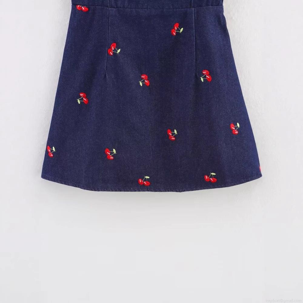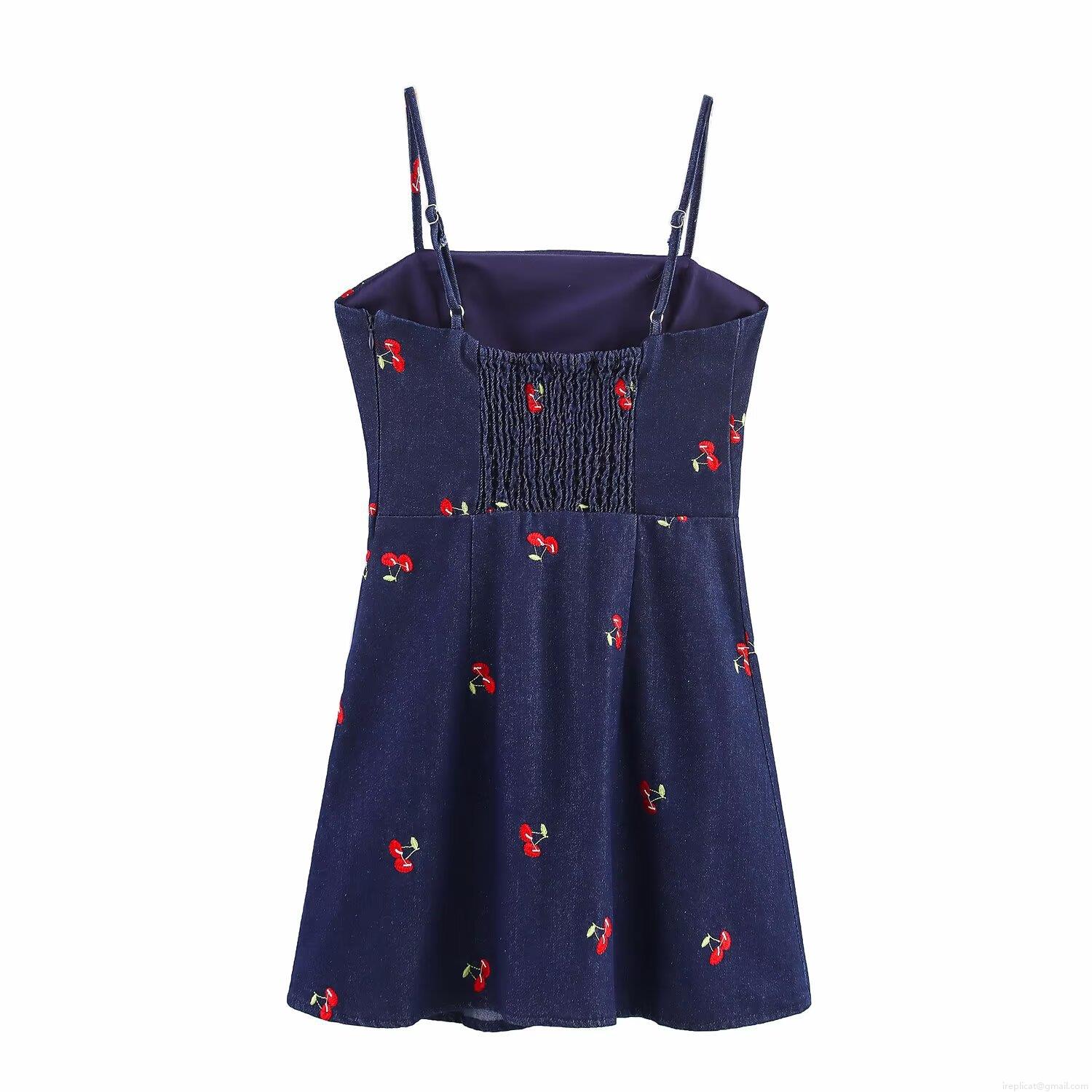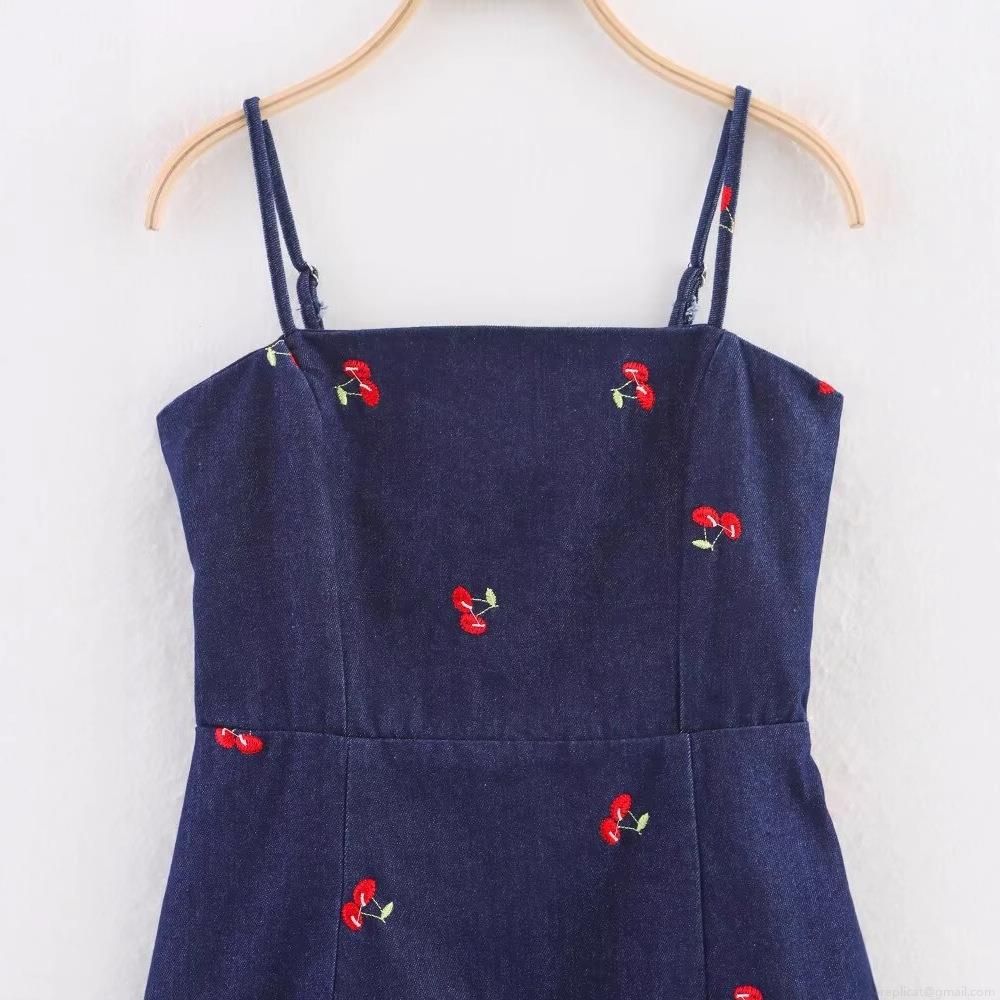• Women Summer Casual Cherry Embroidery Cami Dress Adjustable Spaghetti Strap Denim Look Polyester Mini Dress For Holiday Dating Slim Fit Back Elastic Sleeveless Short Dress