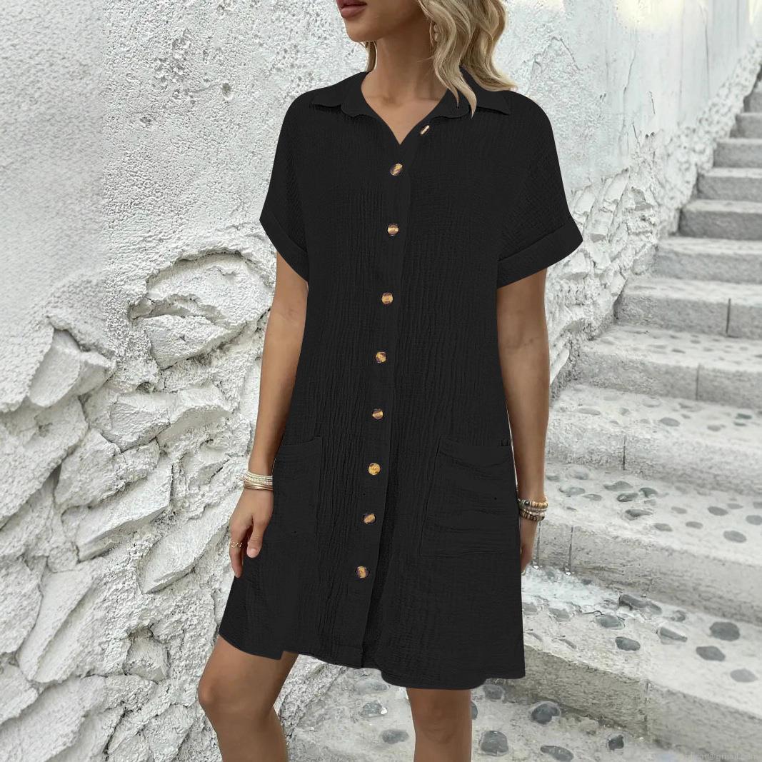 • Women Summer Casual Short Sleeve Shirt Dress Button Down V Neck Crinkled Texture Mini Dress With Pockets Loose Fit Solid Color Beach Vacation Style Sun Dress