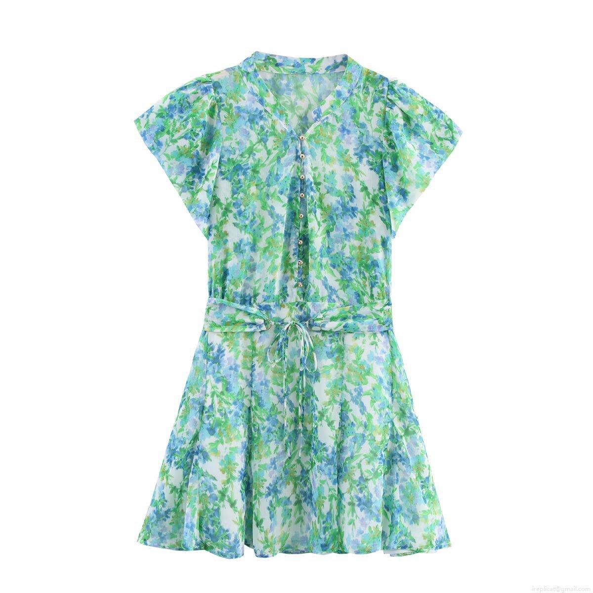 • Women Summer Floral Print V Neck Single Breasted Dress Short Sleeve Waist Tie A-Line Mini Dress For Vacation Beach Street Style Casual Wear