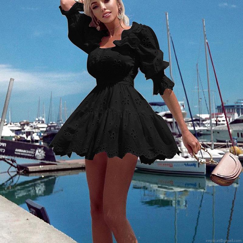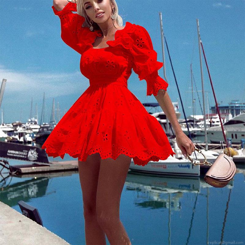 • Women Summer Hollow Out Embroidery Mini Dress Puff Sleeve Square Neck Boho Beach Vacation Short Dress Polyester Cotton Blend Solid Color Elegant Lady Party Wear