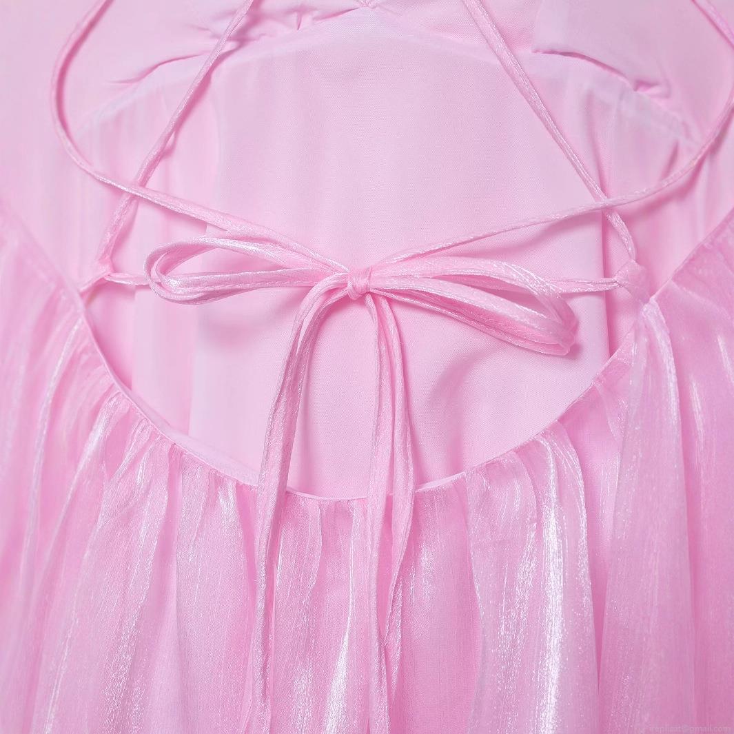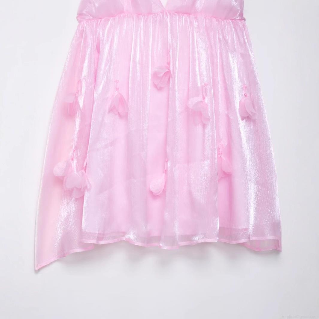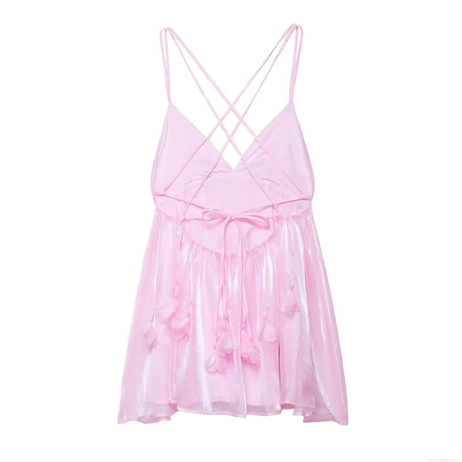 • Women Summer Pink Spaghetti Strap Mini Dress Sexy Backless Cross Tie 3D Floral Decoration Pearlescent Polyester Dress For Party Club
