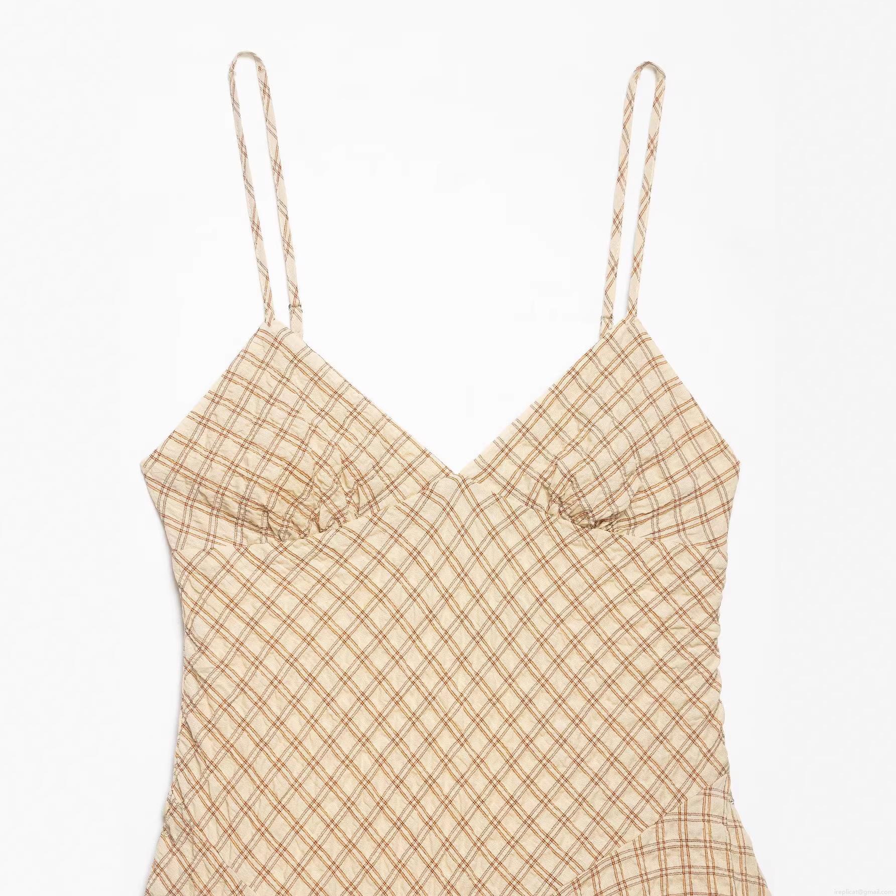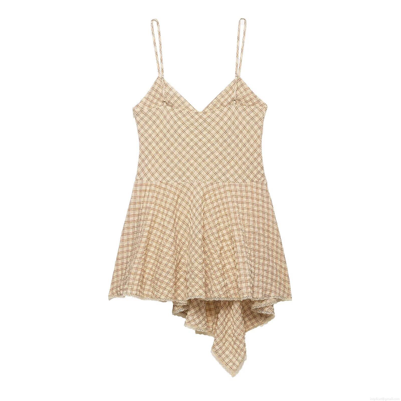 • Women Summer Plaid Lace Trim Mini Dress Seersucker V-Neck Spaghetti Strap Ruffle Hem Lolita Style Sexy Sundress For Vacation Party Casual Wear