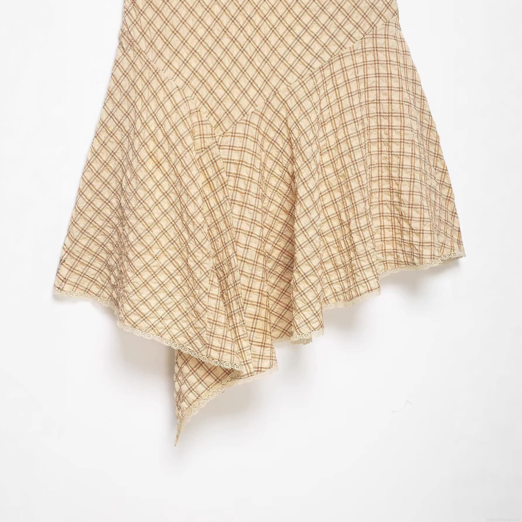 Checkered Pattern, Ruffles, Gathering, Lace Patchwork, Asymmetrical Skirt