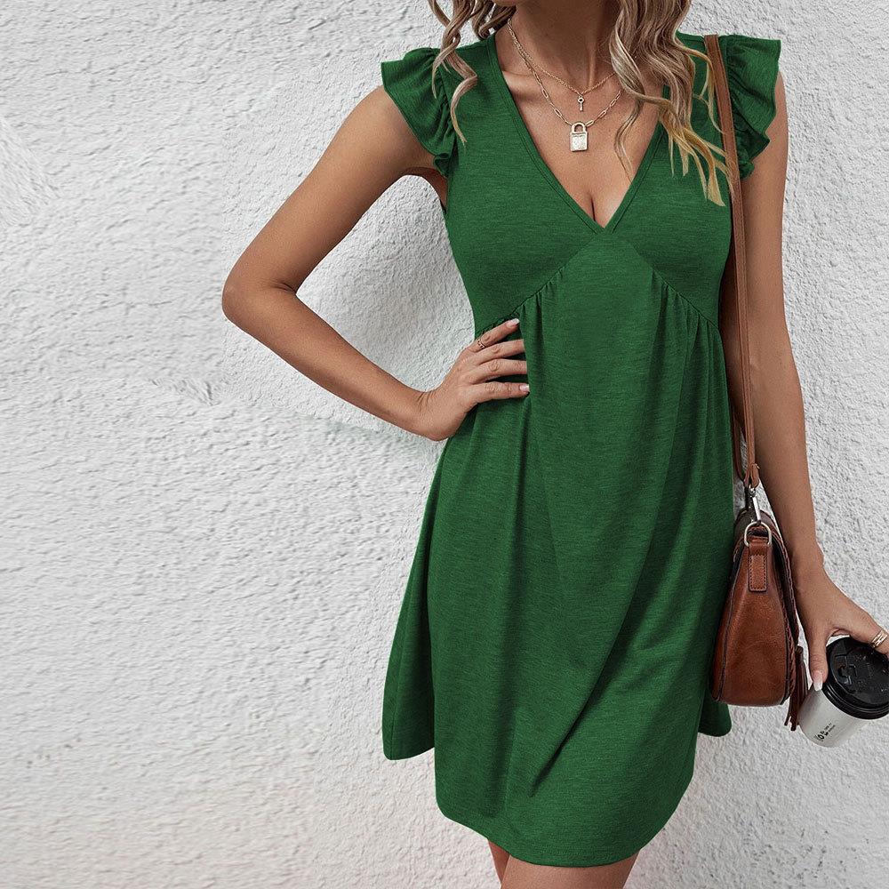 • Women Summer Sexy V Neck Sleeveless Ruffle Mini Dress Casual Solid Color High Waist A-Line Knitted Rayon Polyester Blend Party Sundress