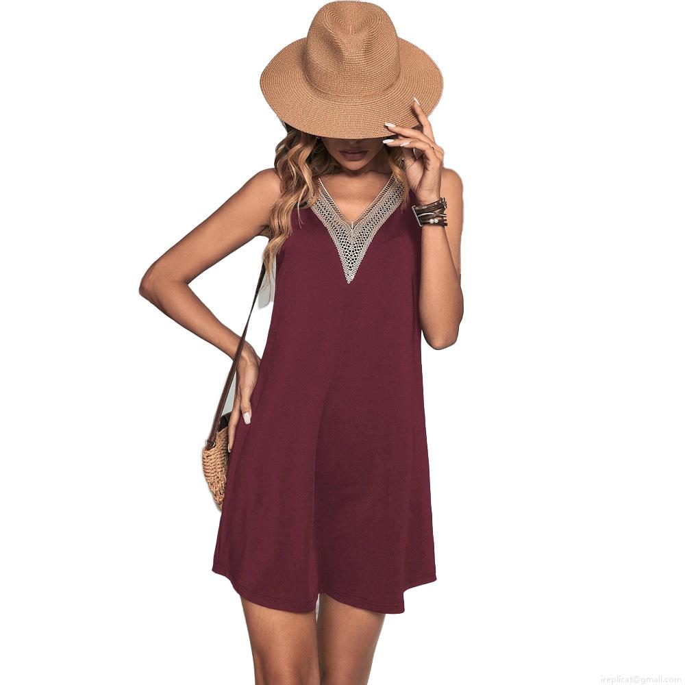 • Women Summer Sleeveless V-Neck Knit Dress With Crochet Lace Trim Casual A-Line Slim Mini Dress Cotton Polyester Blend Vacation Beachwear