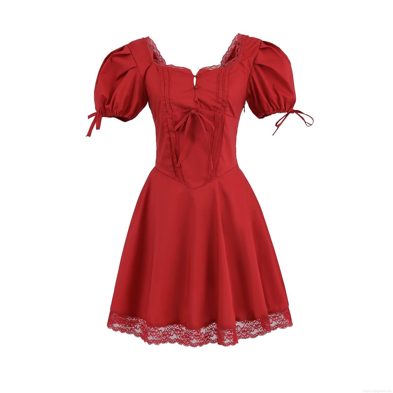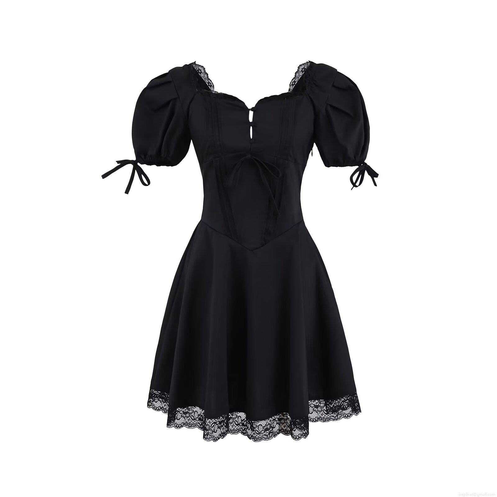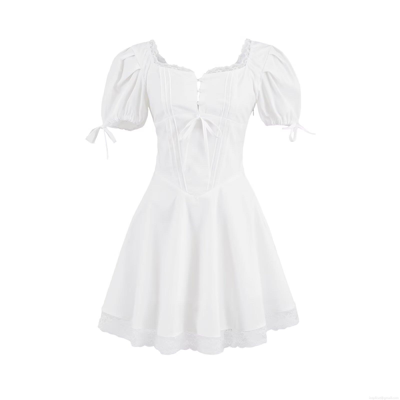 • Women Summer Square Neck Puff Sleeve Lace Patchwork Mini Dress Retro French Style Solid Color Short Sleeve Lacing Pullover Dress For Party Dating