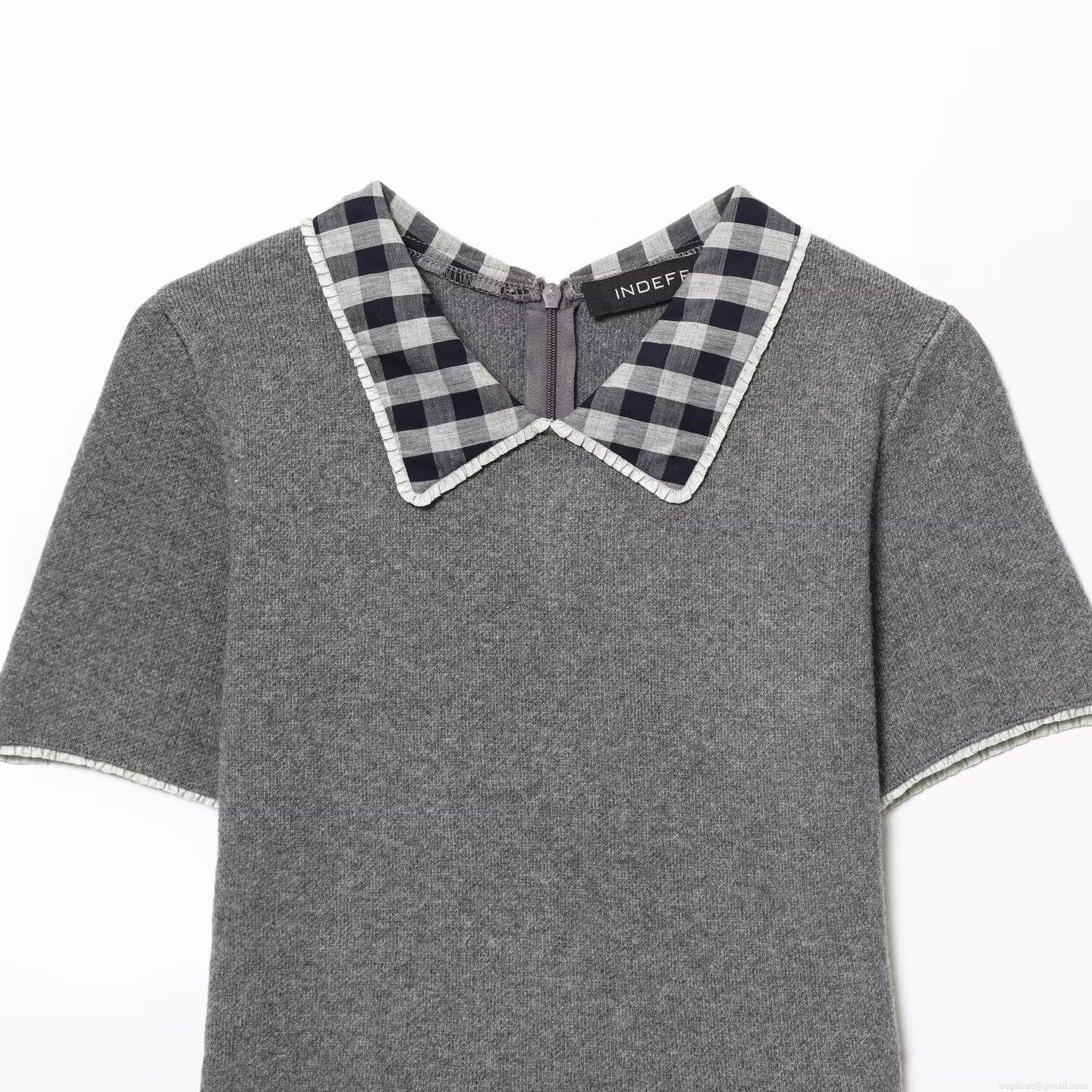 • Women Sweet Grey Knit Short Sleeve Mini Dress With Plaid Peter Pan Collar A-Line Preppy Style Slim Fit Knitting Short Dress For Daily Dating
