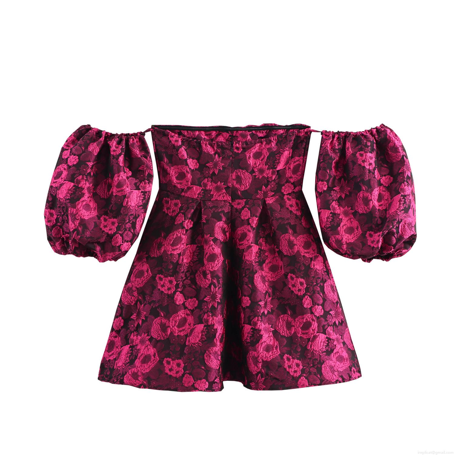 Jacquard, Floral Pattern, Zipper, Puff Sleeves, Off-shoulder, High-waisted, Jacquard Flowers