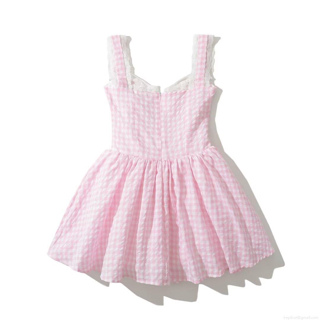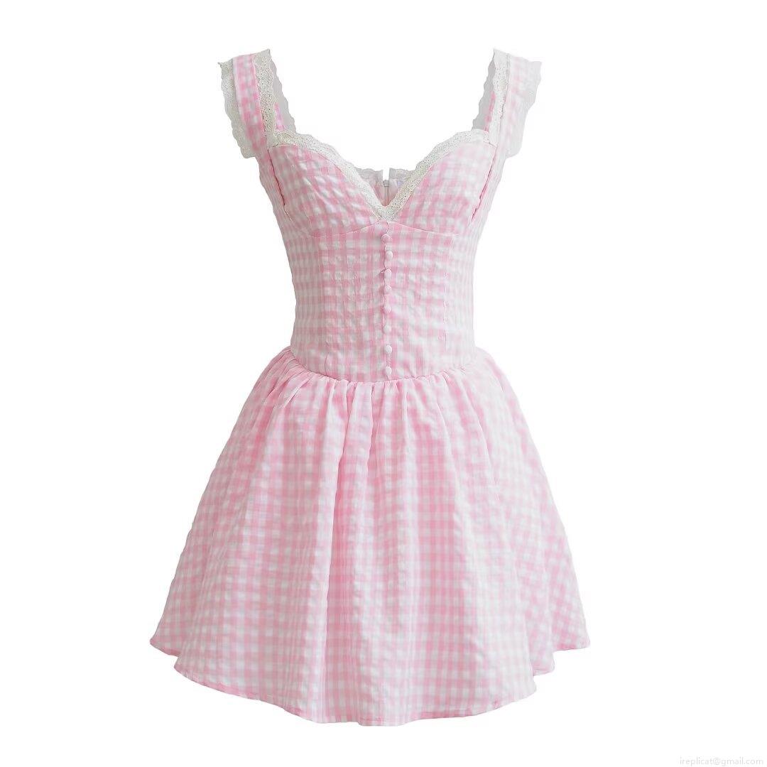 • Women Sweet Pink White Plaid Mini Dress Lace Trim Sleeveless V-Neck A-Line Short Sundress French Vintage Style Polyester Summer Casual Dress For Dating Party