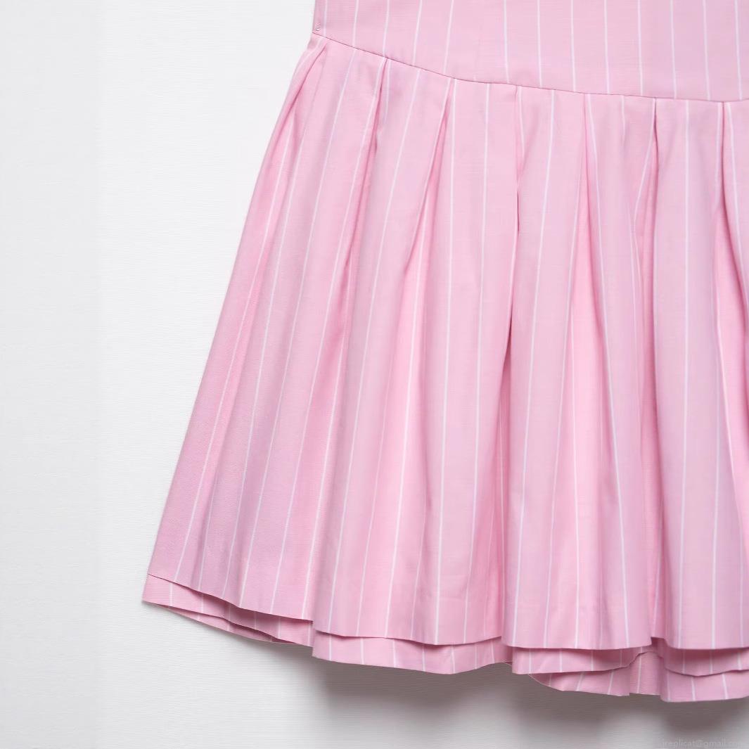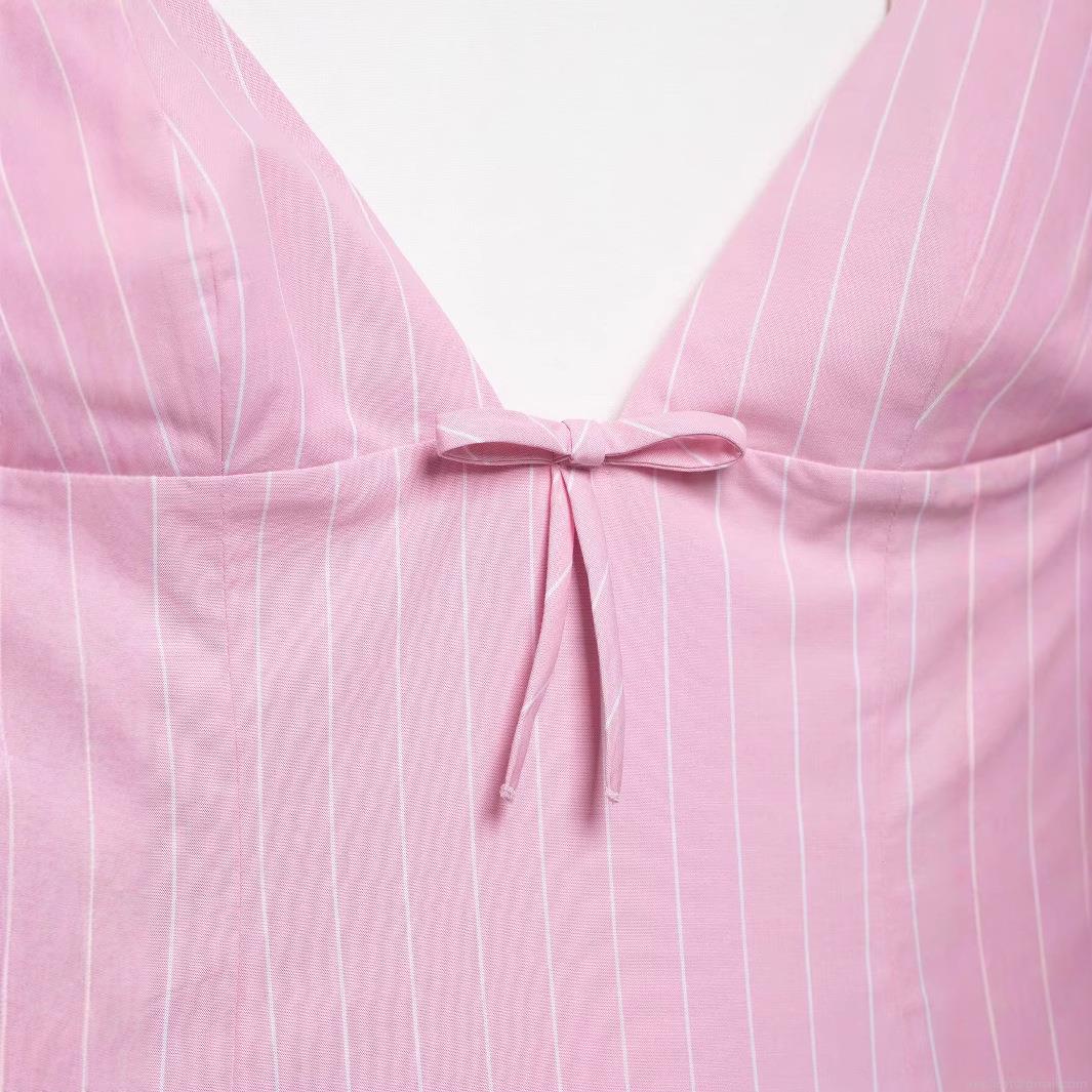 • Women Sweet Pink White Vertical Stripe Cami Mini Dress Bow Knot Decor Pleated Hem V Neck Polyester Summer Dress For Casual Beach Party Street Style