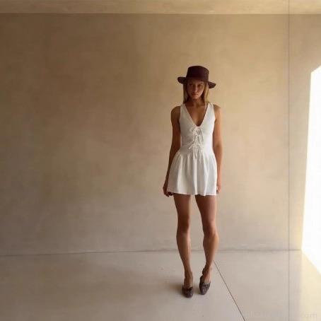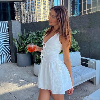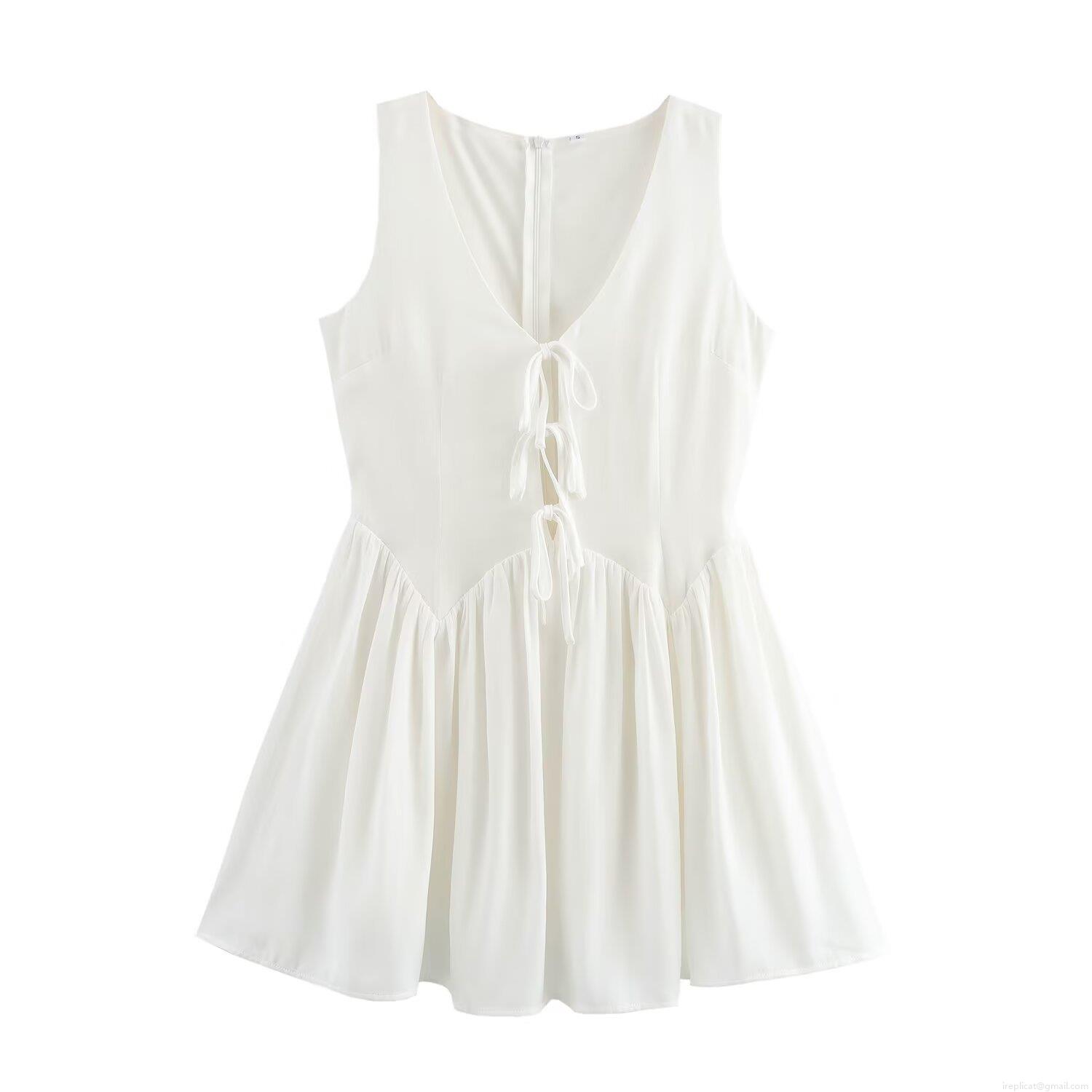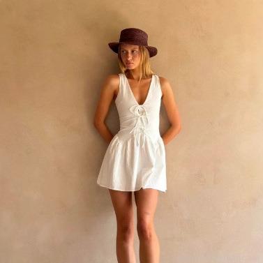 • Women Sweet Style Deep V-Neck Sleeveless Mini Dress White Polyester Lace-Up Bow Ruffle Trim High Waist A-Line Dress For Summer Vacation Date Party