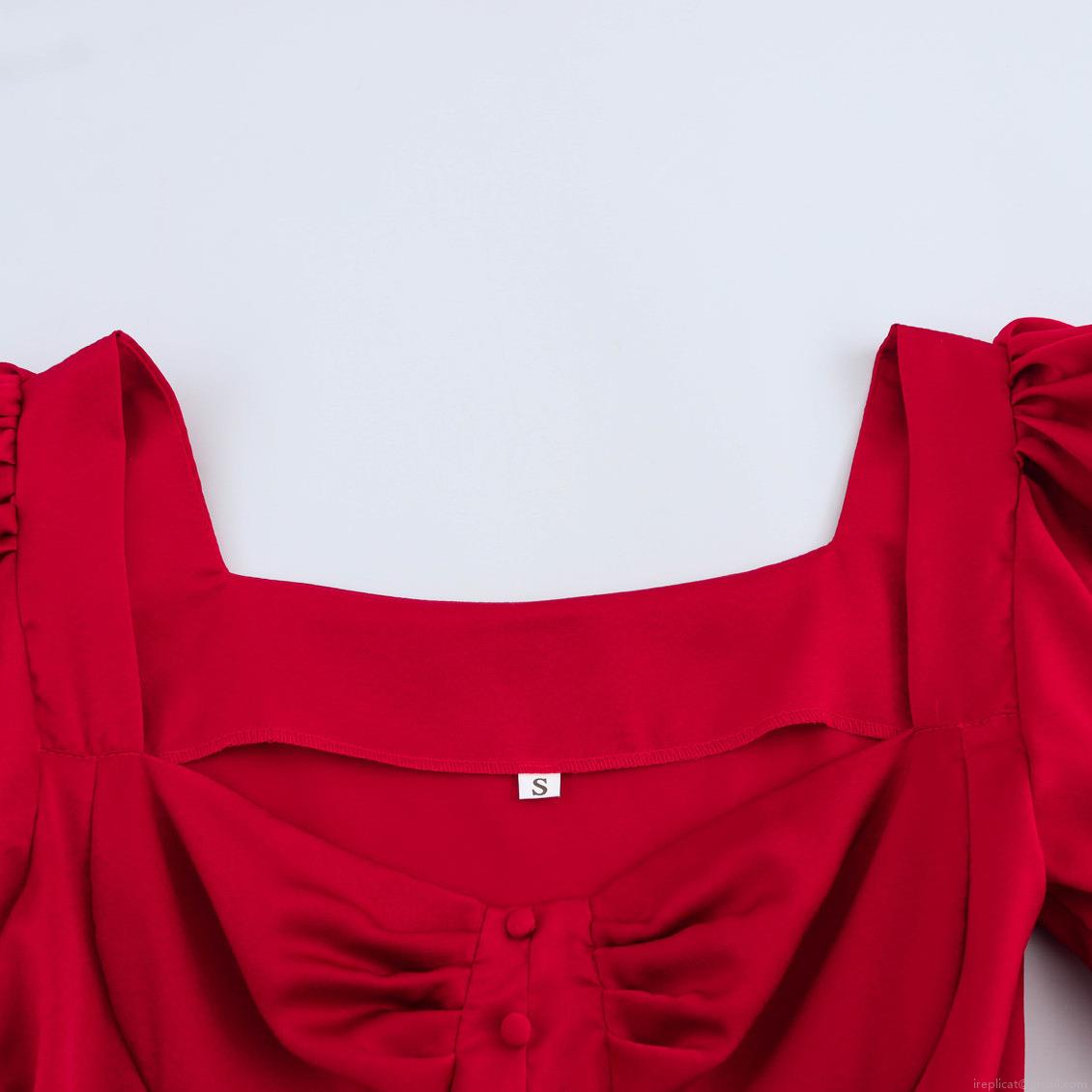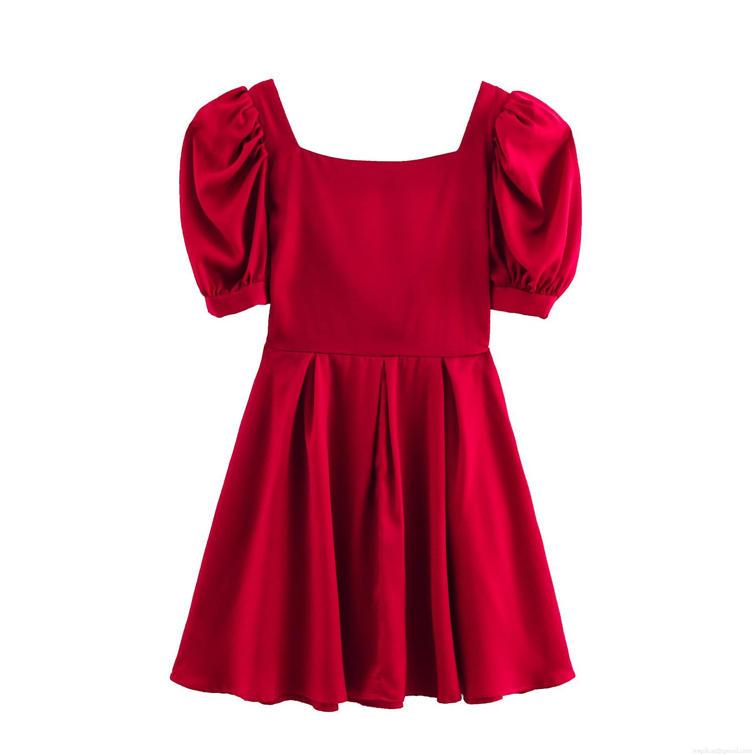 • Women Sweet Wine Red Puff Sleeve Dress Elegant Square Neck Pleated Satin Mini Princess Dress For Party Dating Ladies Summer Short A-Line Dress