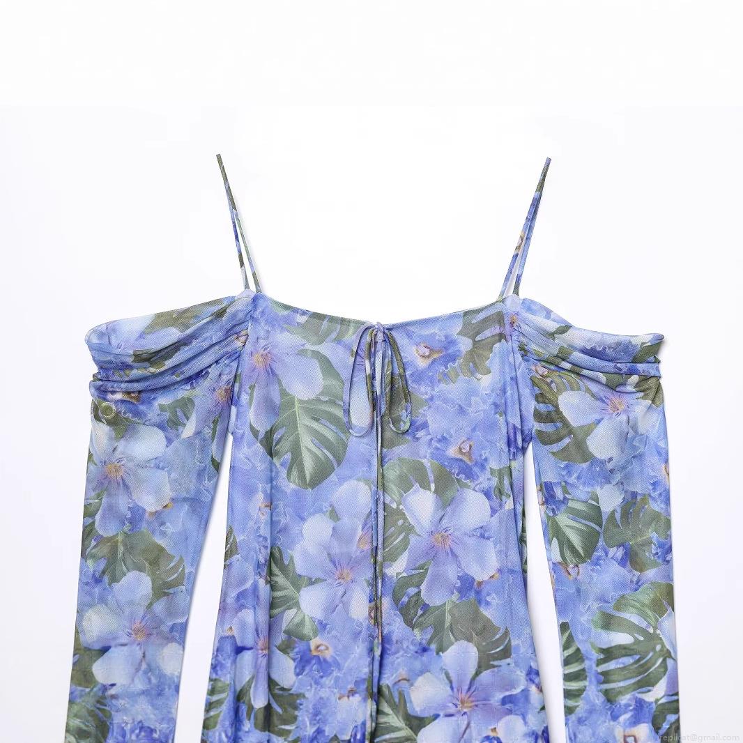 • Women Tropical Floral Print Mesh Mini Dress Cold Shoulder Long Sleeve Drawstring Elegant Slim Fit Club Party Summer Dress
