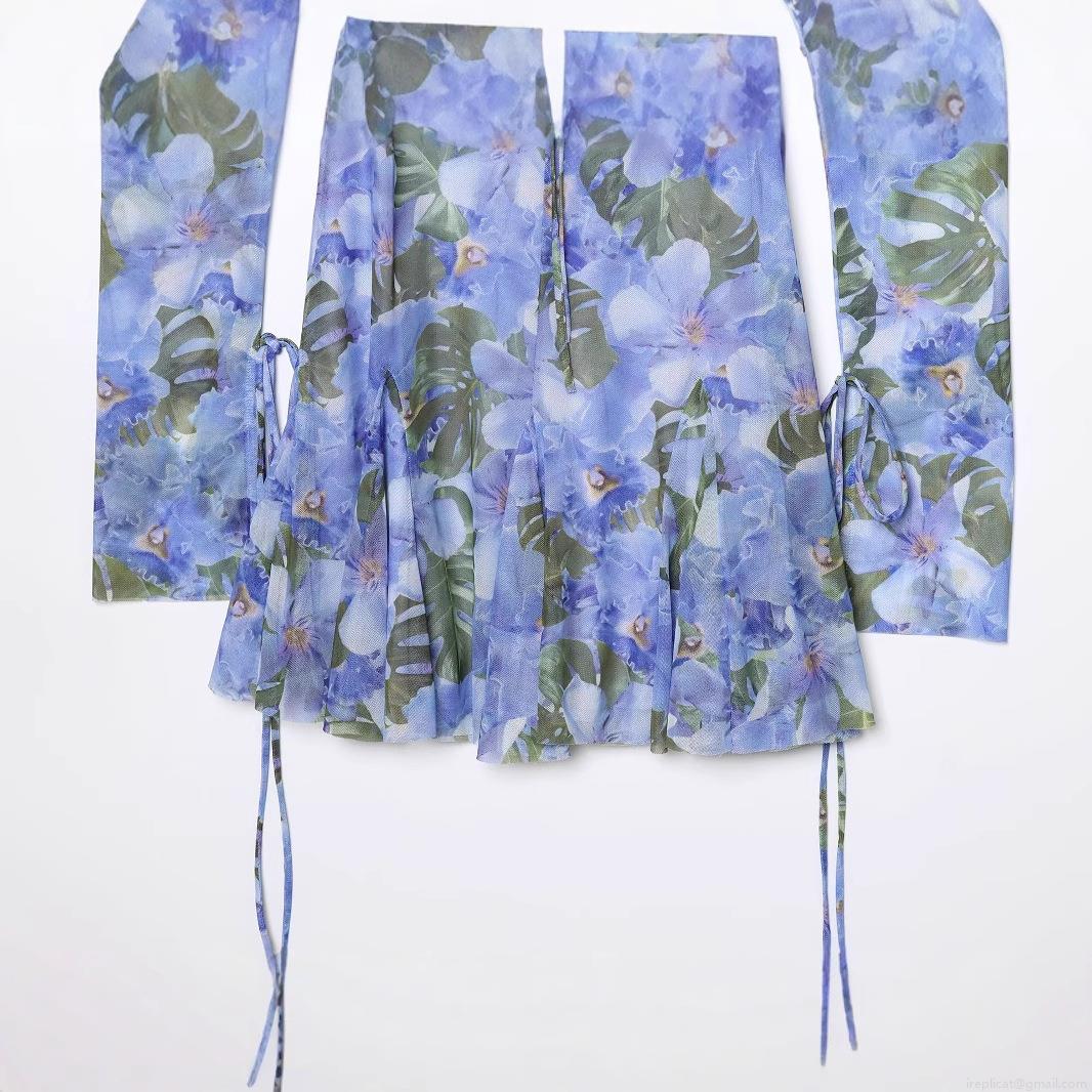 Women Tropical Floral Print Mesh Mini Dress Cold Shoulder Long Sleeve Drawstring Elegant Slim Fit Club Party Summer Dress