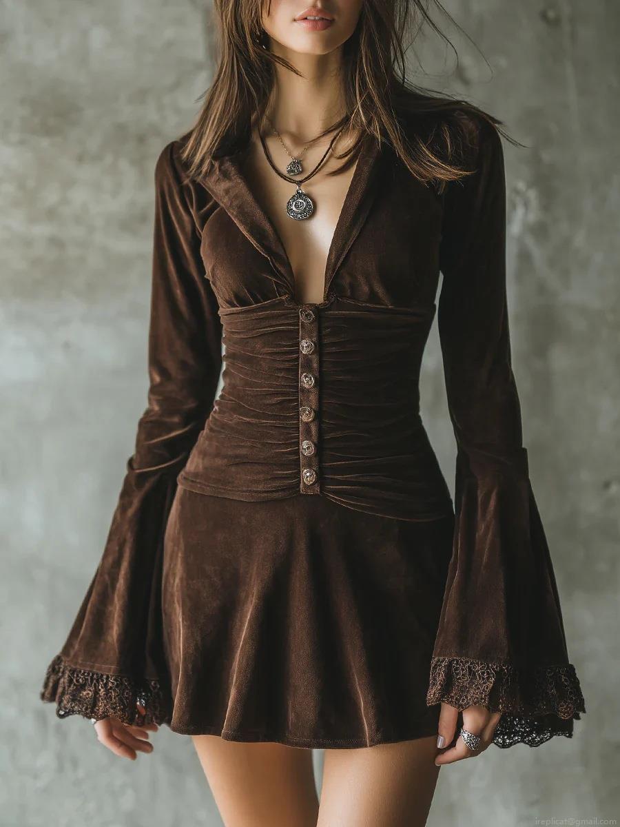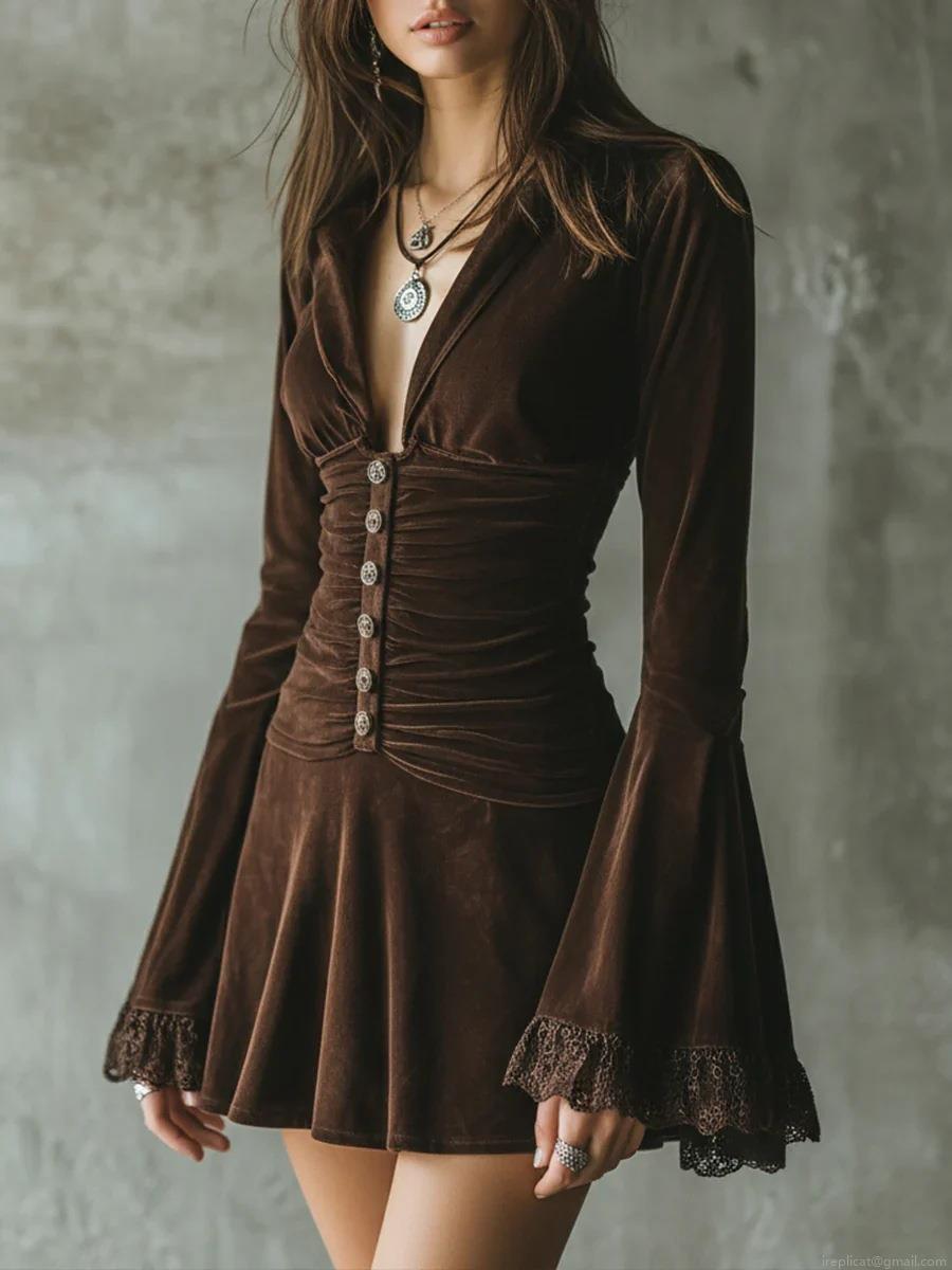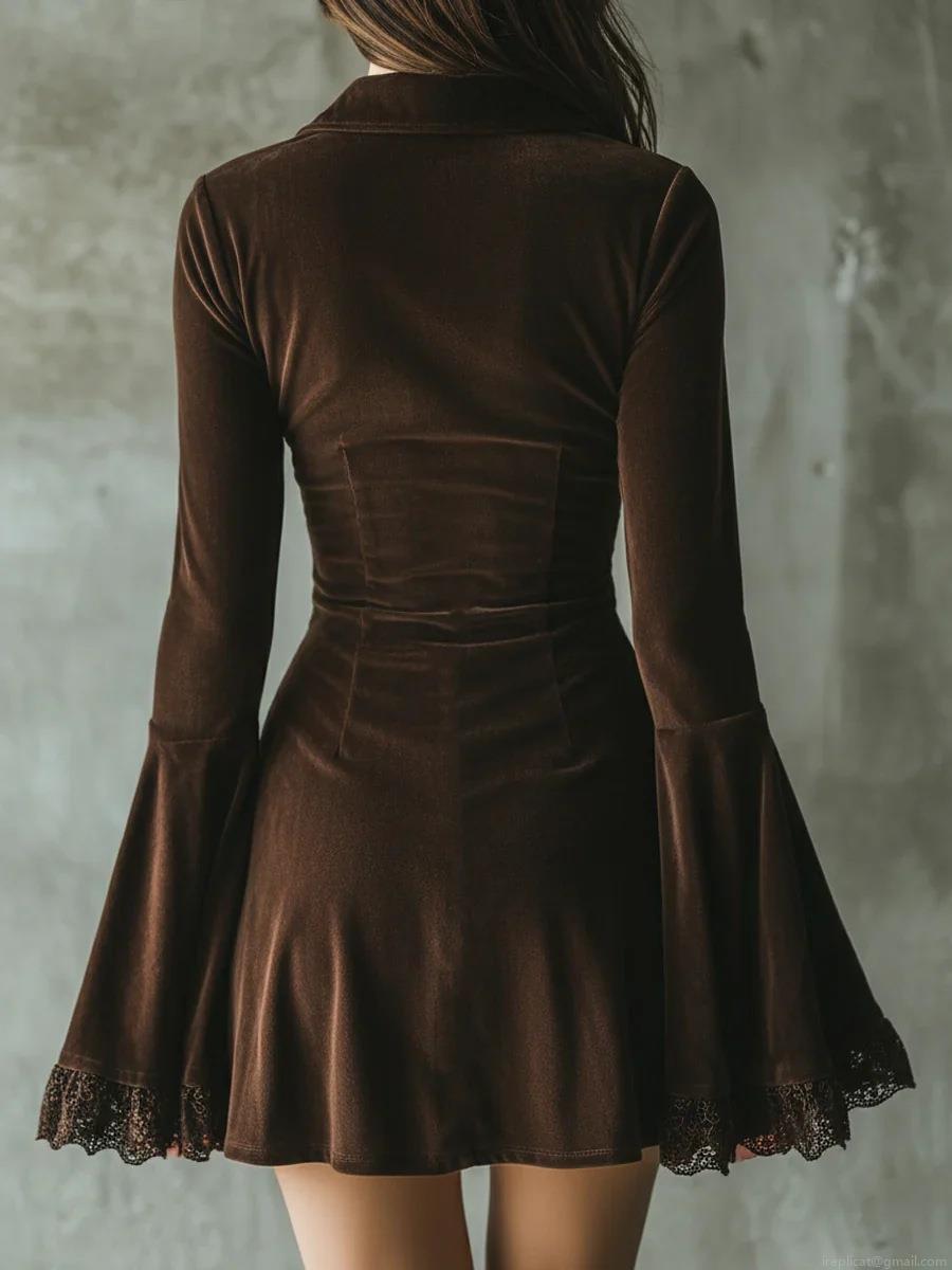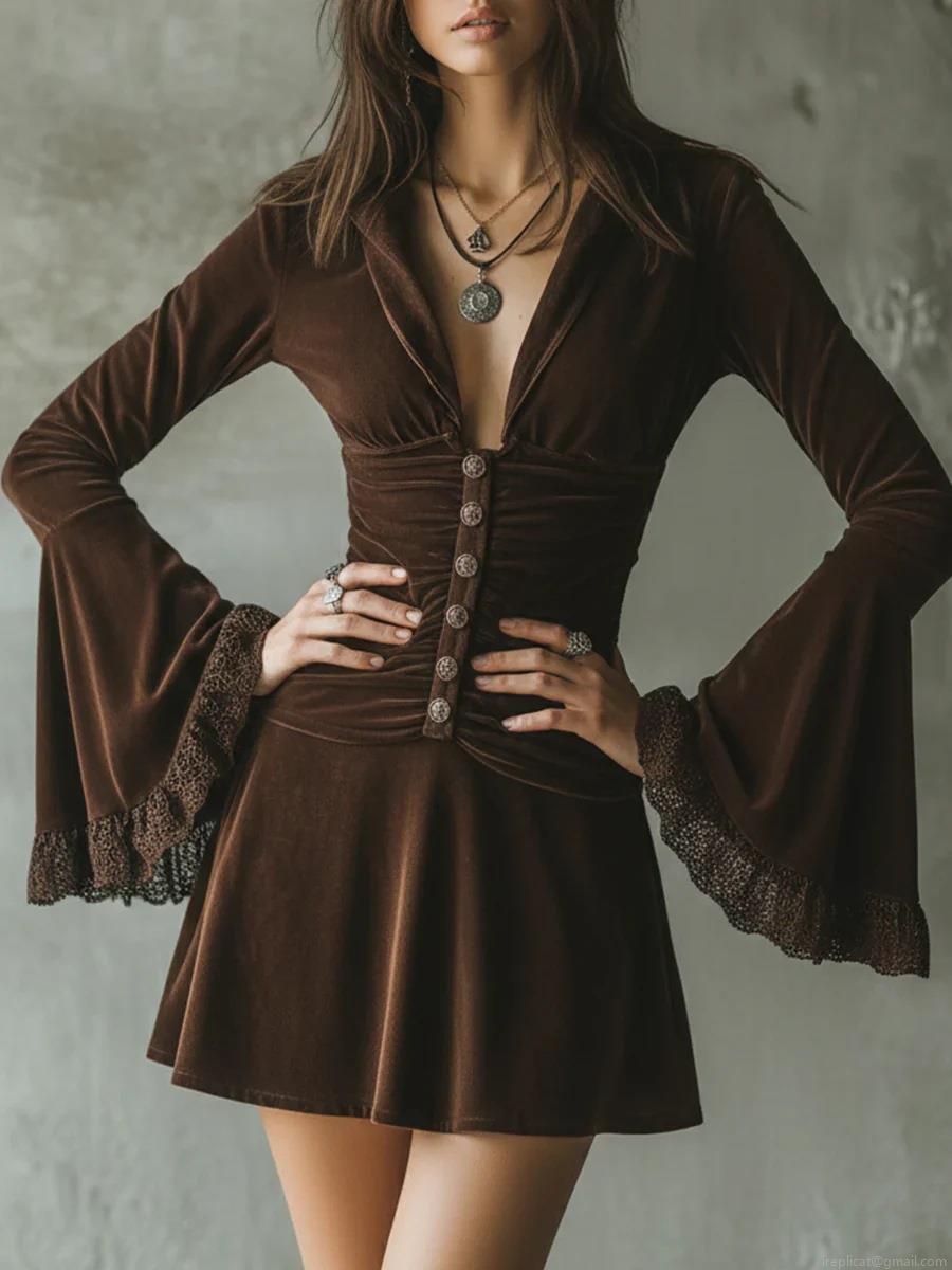 • Women Velvet Bell Sleeve Dress Vintage Sexy V-Neck Button Slim Fit Long Sleeve Lace Trim Autumn Winter Party Mini Midi Dress For Women