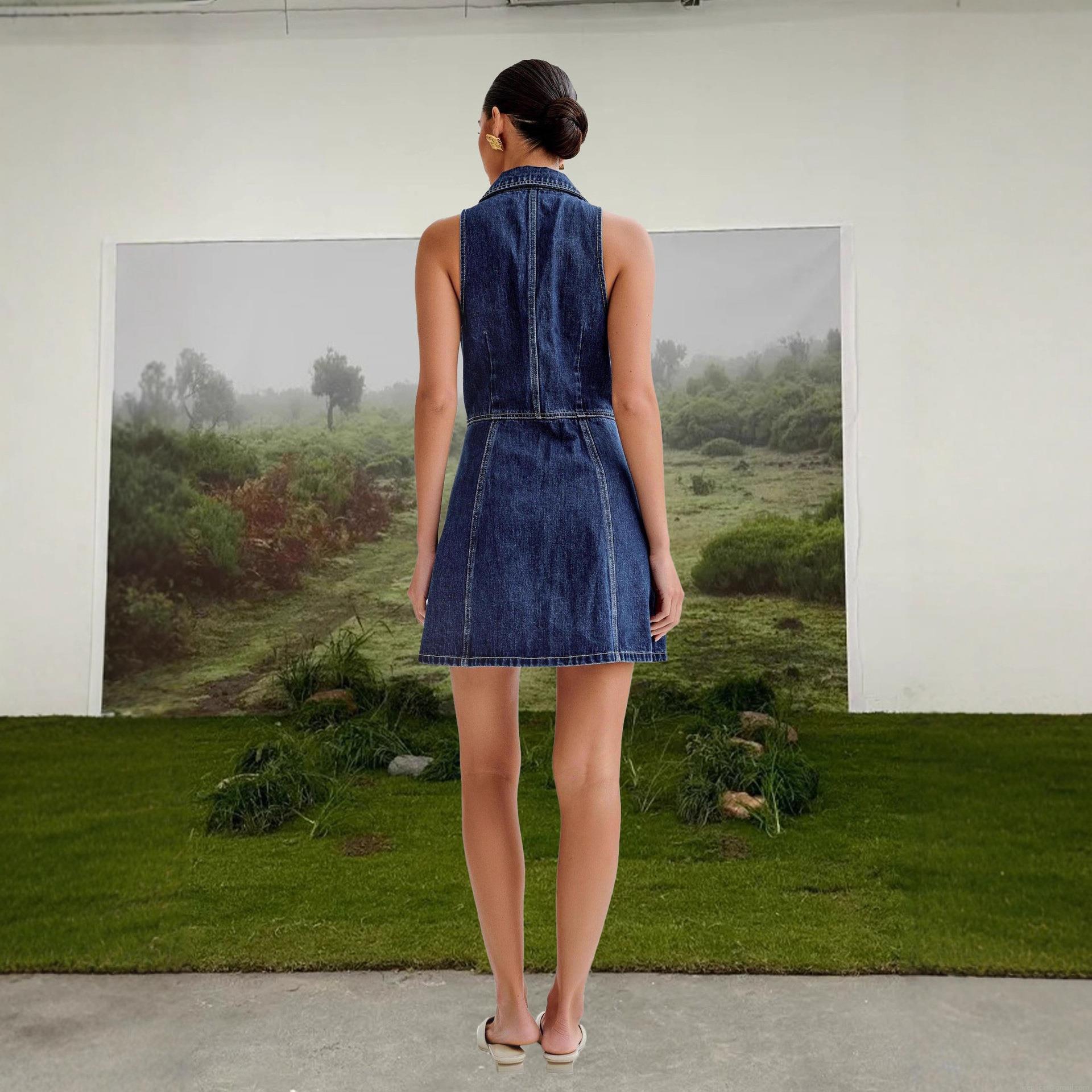 • Women Vintage Denim Mini Dress Sleeveless Lapel Single Breasted Gold Button Down Slim Fit A-Line Jean Dresses For Summer Streetwear Sexy Party Outfits