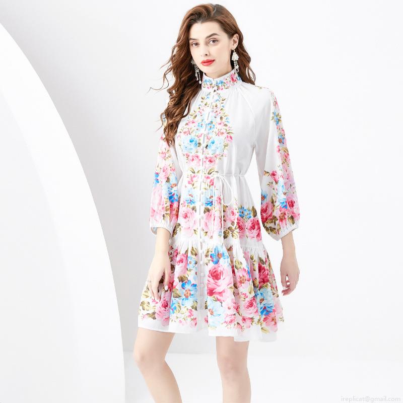 • Women Vintage Floral Print Mini Dress Elegant Stand Collar Lantern Sleeve Button Drawstring Waist White Rose Flower Short Dress For Spring Summer Commuting Party