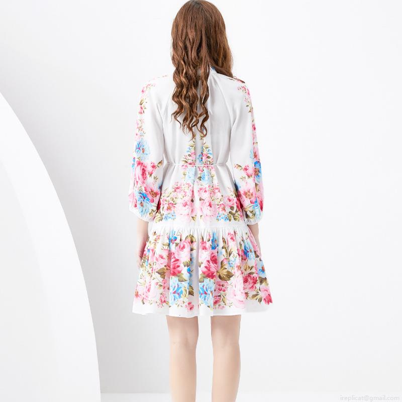 Women Vintage Floral Print Mini Dress Elegant Stand Collar Lantern Sleeve Button Drawstring Waist White Rose Flower Short Dress For Spring Summer Commuting Party