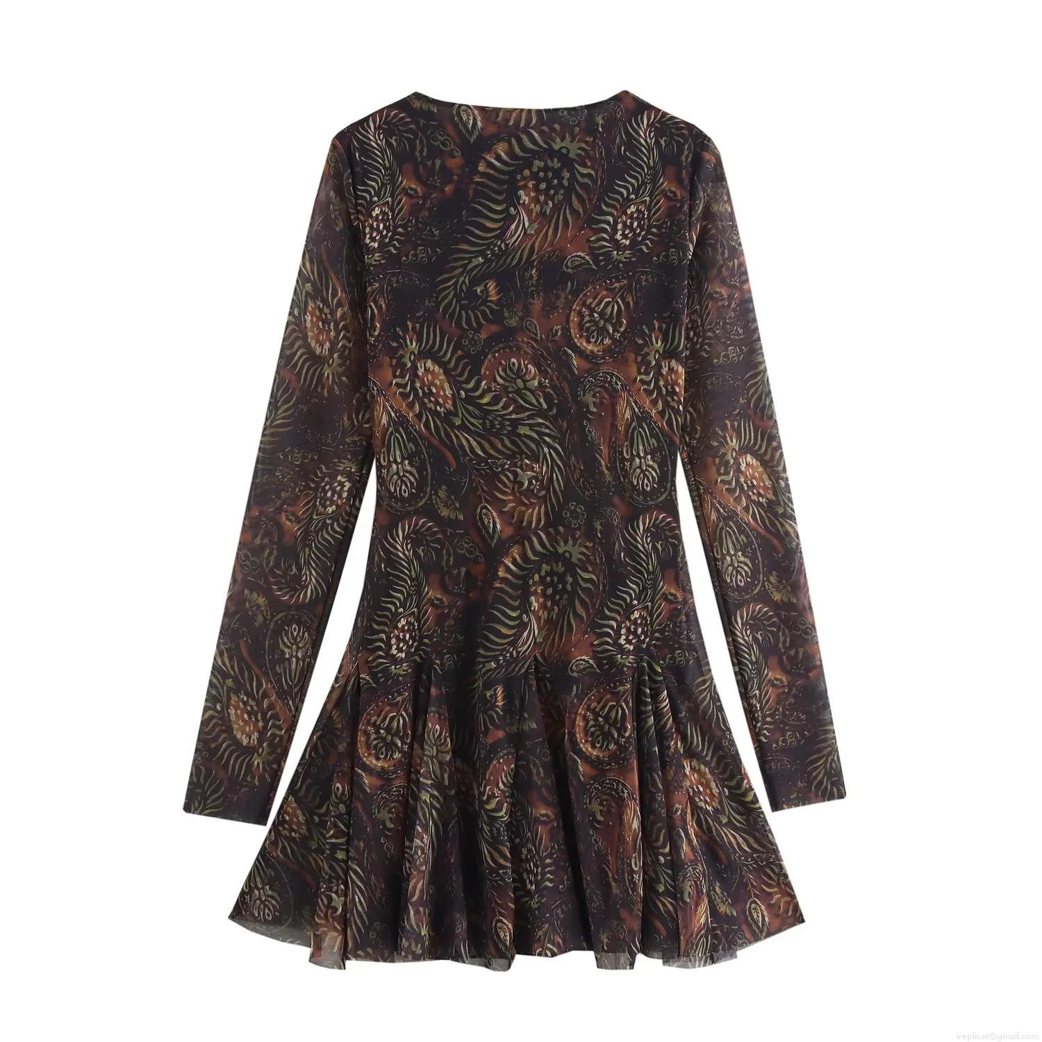 • Women Vintage Paisley Print Mesh Mini Dress Long Sleeve Round Neck Elegant A-Line Mesh Dress For Party Socialite Style Retro Brown Dress