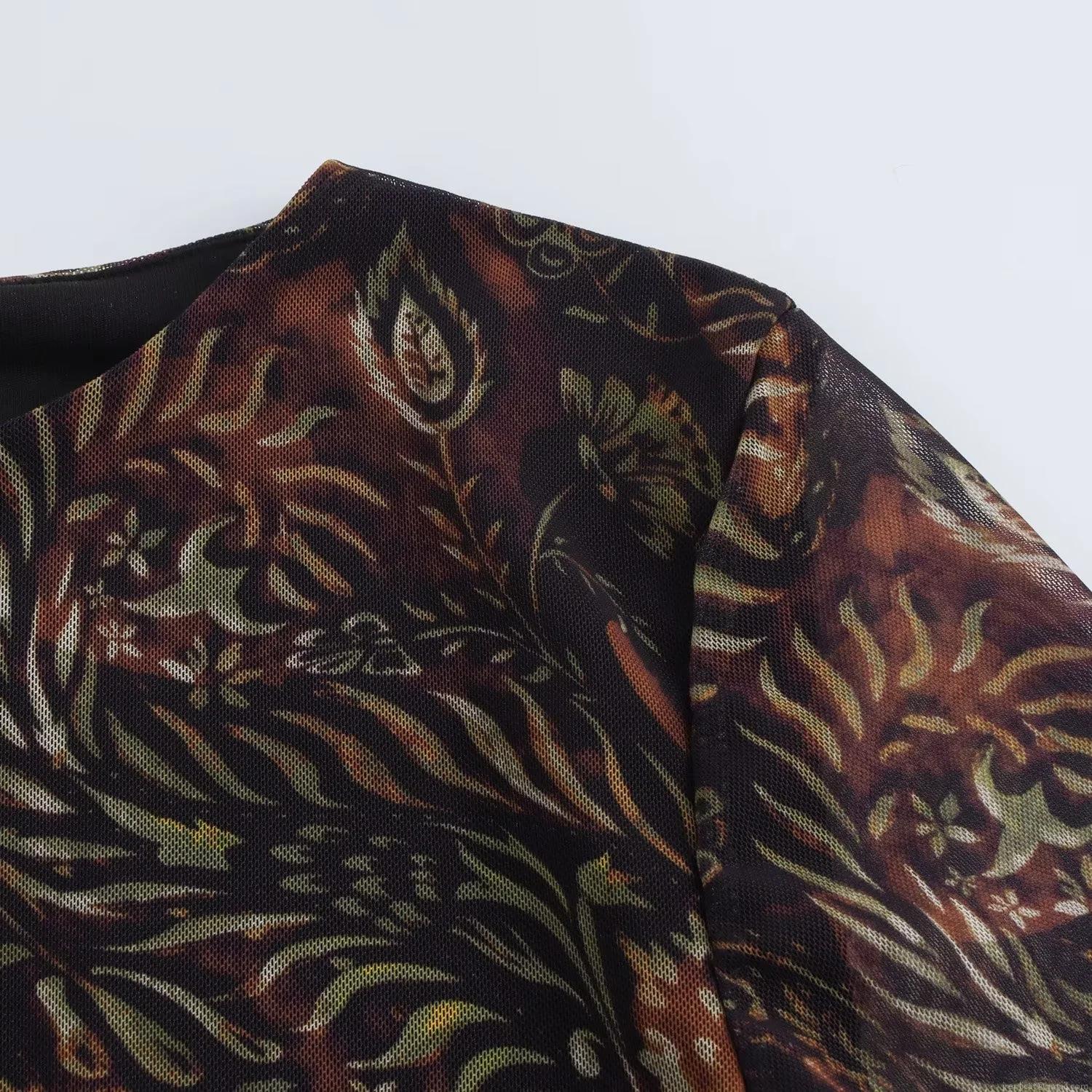 Women Vintage Paisley Print Mesh Mini Dress Long Sleeve Round Neck Elegant A-Line Mesh Dress For Party Socialite Style Retro Brown Dress