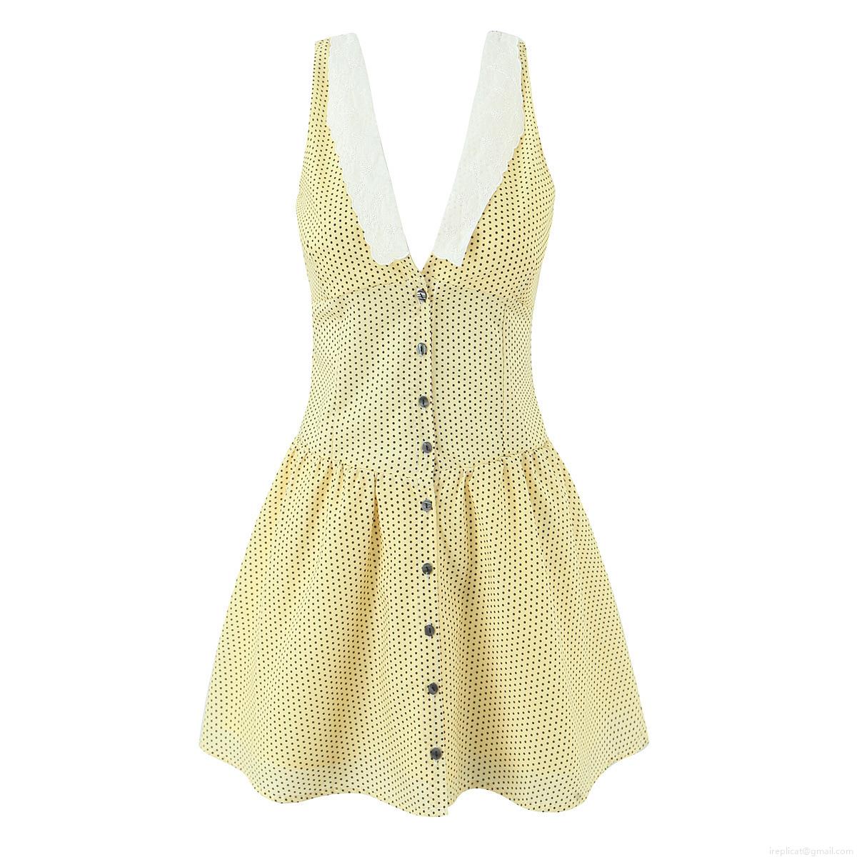 • Women Vintage Yellow Polka Dot Sleeveless Mini Dress Polyester White Lace Embroidery V-Neck Button Down A-Line Tank Dress Elegant Summer Party Sexy Short Dress