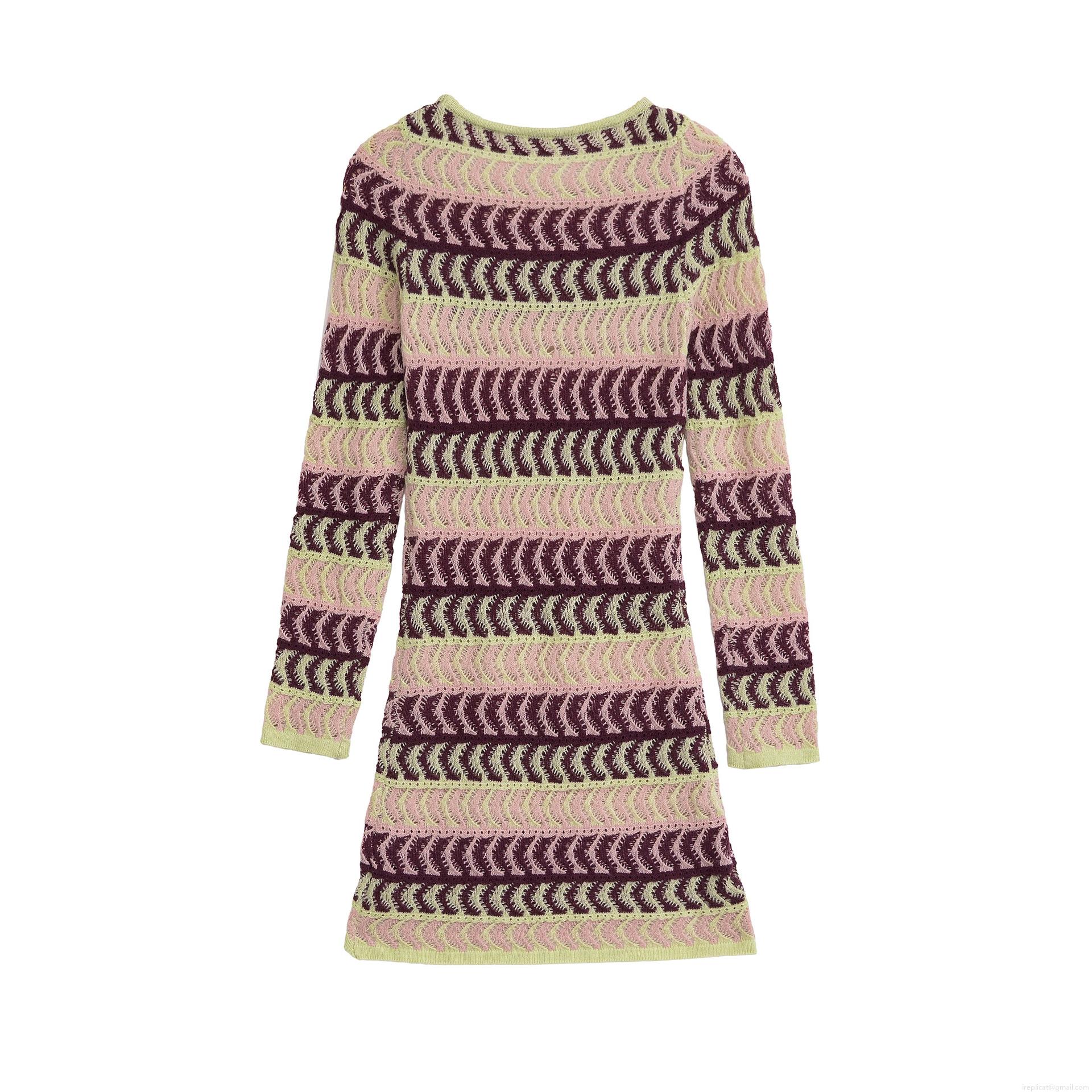 • Women Wave Striped Knit Dress Color Block Long Sleeve Crochet Hollow Out Slim Fit Mini Dress Pink Purple Green Elegant Party Wear